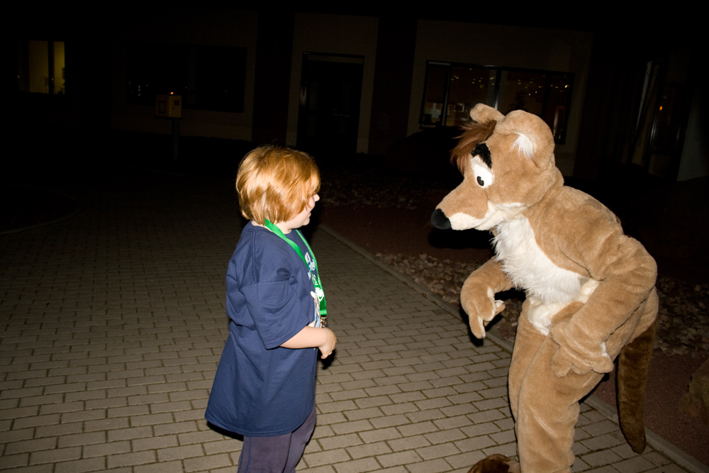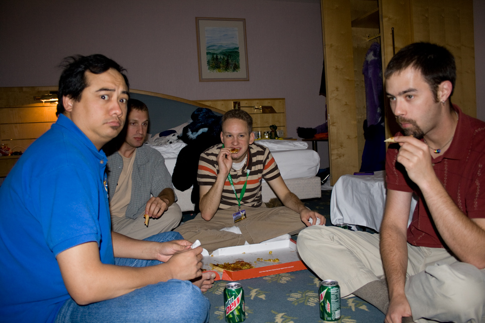 The Cutlets were like leather.. bleeding leather. The sausages tasted like floor and well that was about everything they had. At least I got to annoy the GoH table with our megaphone and got a chance to say hello to Yippee and Croc. Opening ceremony was nice.. Later, small Tyler caused mischief in the Lobby again.