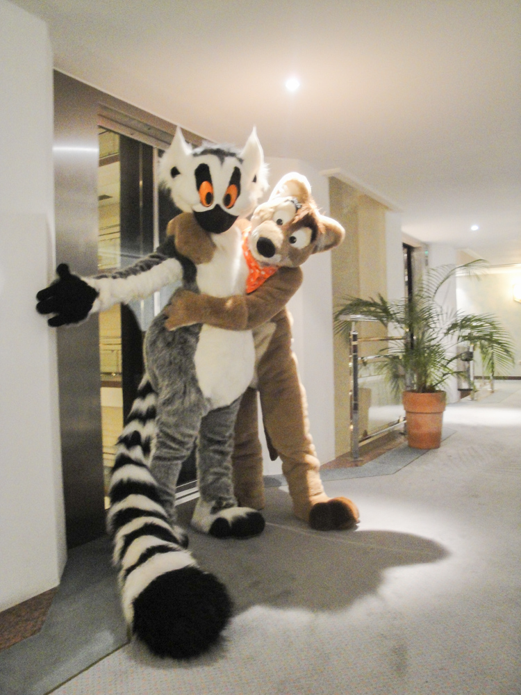 Outside the hotel I was interviewed by a german lady for an article in the Hamburger Morgenpost. Back in the lobby, Tyler got some giftart drawn by some dutch guy with the help of Shay. Thanks again! I got a headache and took a nap in my room until Henrieke returned from the fursuit game preliminaries. Kiki and Titash made the last place by the way, but probably were the most awesome team. Henrieke and I went to the Dealers Den afterwards, talked to artists and Henrieke got her 4 meters of fur for Lindy the blue-eyed lemur. Then we went to the room again with Kougo and chatted a bit.