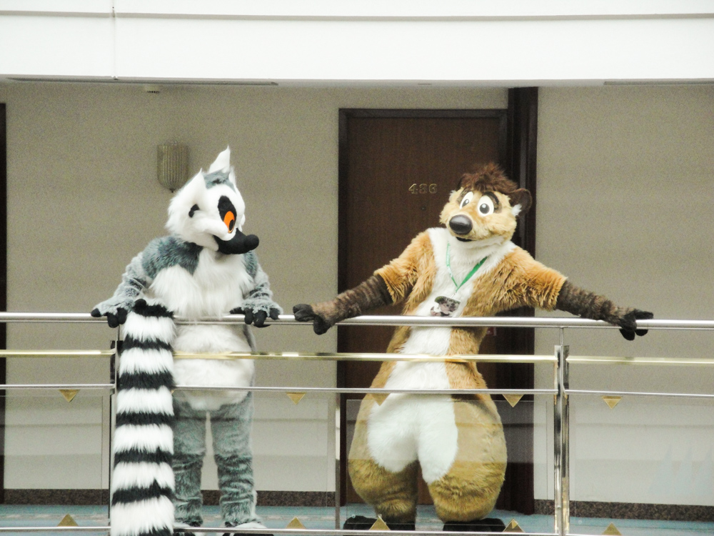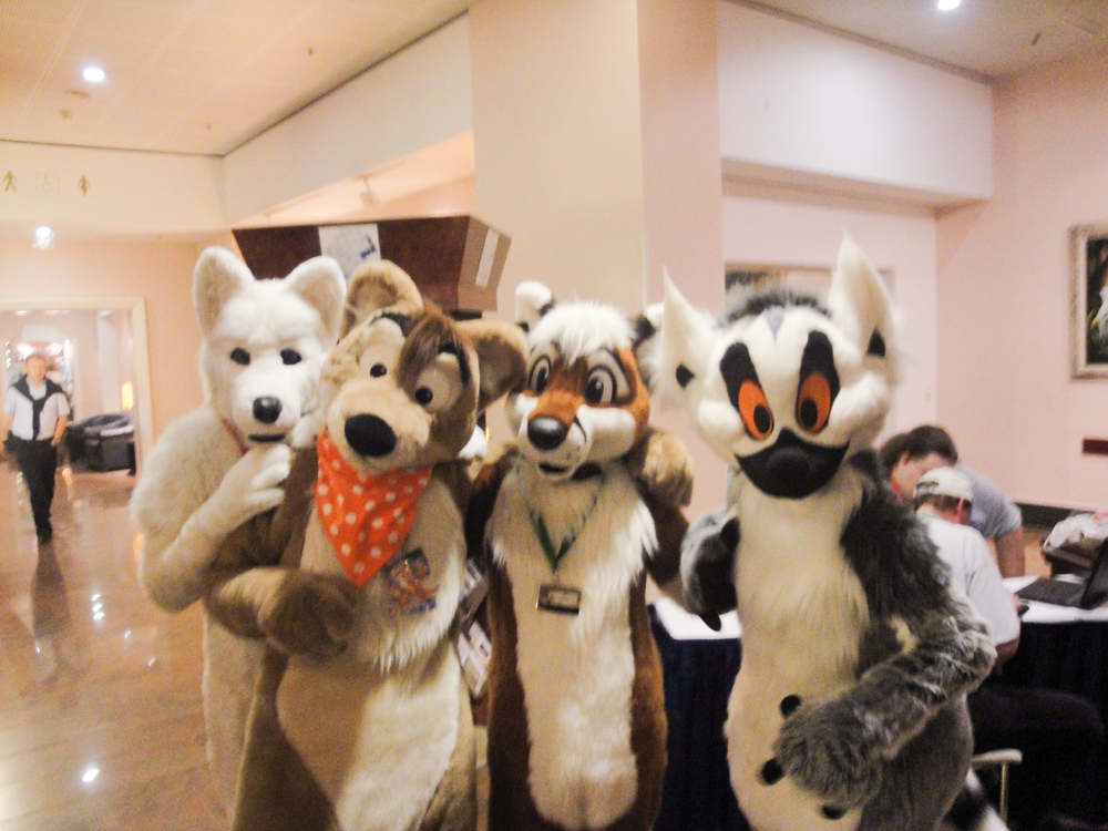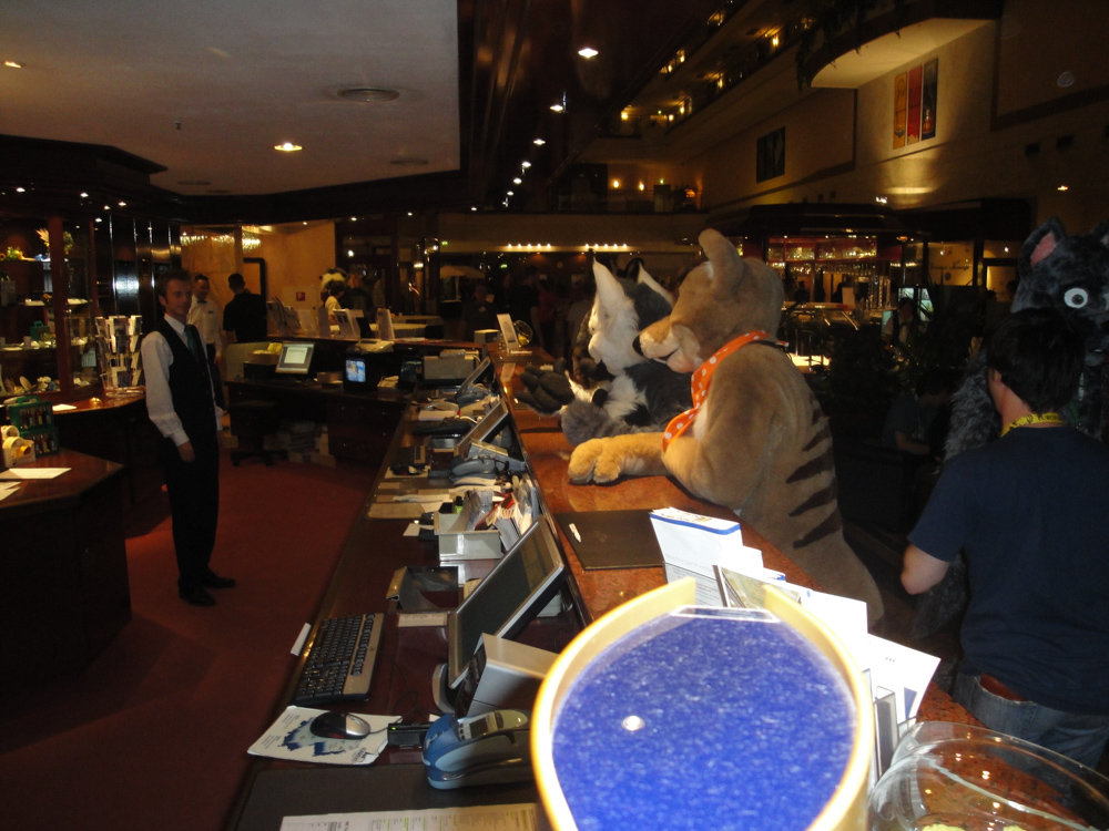 Got up at 11:00 and went to fursuit photoshoot. We didn't manage to get an appointment anymore though. Afterwards we went to the Dealers Den with Katara and Ashanti. Outside of the Hotel lots of fursuiters were waving to cars, getting only positive reactions. Met Duncan outside who was about to go to the mall to get sewing supplies since a seam on his roo suit popped, but since I always have my toolkit with me I was able to provide him with what he needed. Went down to the Dealers Den again to Henrieke's temporary table where she sold patches and drawings. Since Yamavu wasn't there, I took his table in the meanwhile and sold one commission to a very nice Brit who had a Crux character.