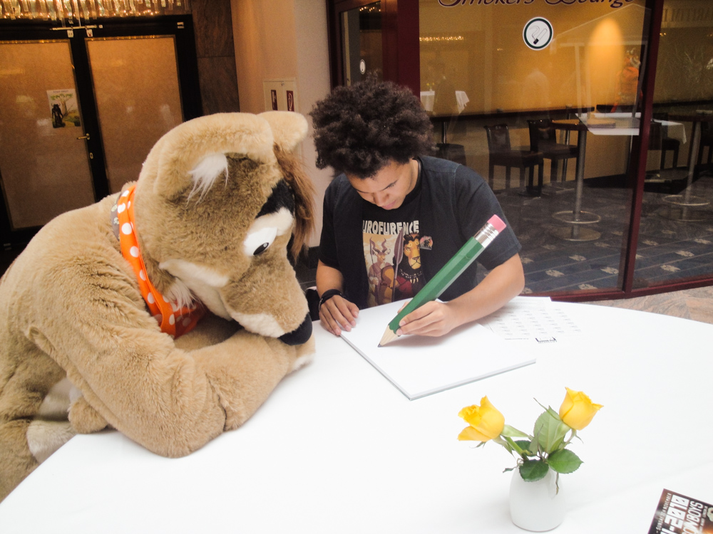 He drew a commission for Maverique and interacted a bit with JD. Since Henrieke had some contact lens problems, we went to the room again. Henrieke went to the Artist Lounge along with Tyler, who took his giant sketchbook and pencil with him in order to art jam with Sonny and JD.