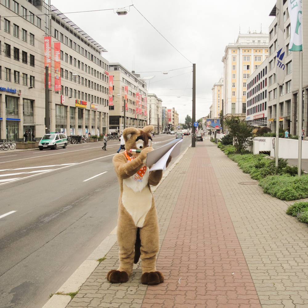 The parade was through the whole hotel at first, then there was a group shot in the lobby and afterwards we went to the "Hundertwasser Haus" near the city center. Since the route was announced in a Newspaper, a lot of people waited for the giant animals, and reactions were more than positive with so many kids laughing. Being back in our room, we called Tabbie and found out they just went to the "Palazzo" Italian restaurant next to the hotel, so we joined Tabbie, Spikie, Yotie and TopDog for a very tasty lasagne while it rained out of buckets outside. While waiting for our food, I finished the Sketchbook trade drawing for JD and went to Kaufland with TopDog afterwards to pick up some drinks.