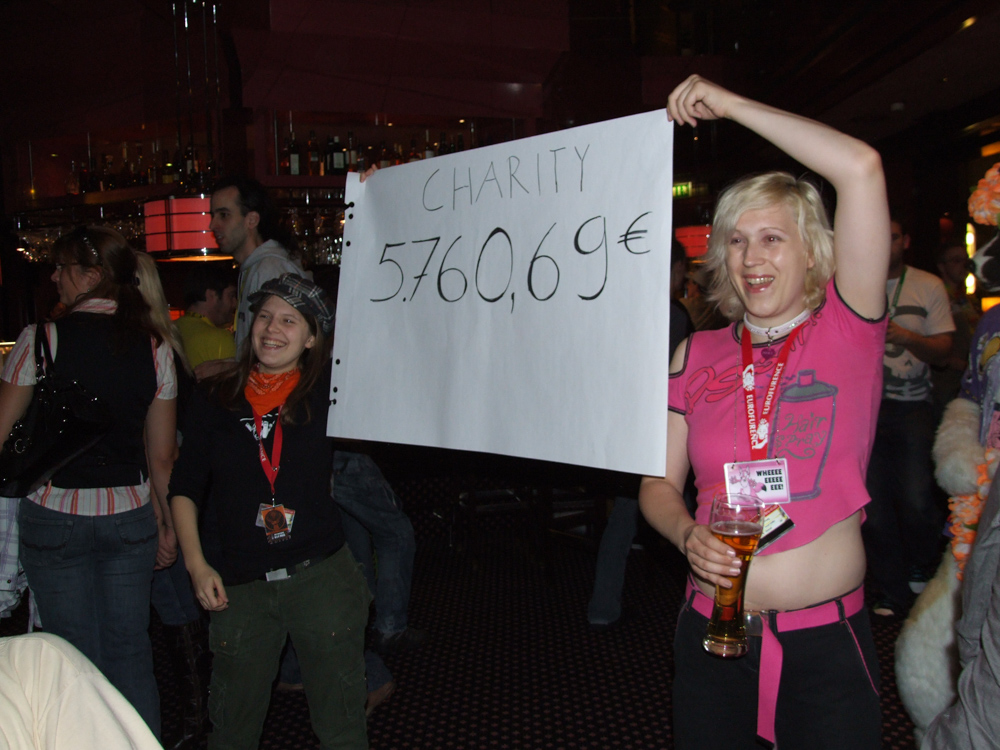 We got mostly funny reactions, though some furries don't get irony even when you shove it into their face. Our badges were visible at all times, defeating the purpose of wearing masks to stay anonymous. We even had a better idea, which was putting the masks on other people and giving them the signs before they notice what happens and identifying them as haters. ;) At 4:00 people were still in the Pianobar, but we were wasted so Henrieke and I picked up Tyler from the fursuit lounge and went to bed.
