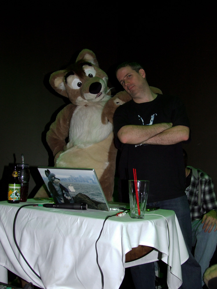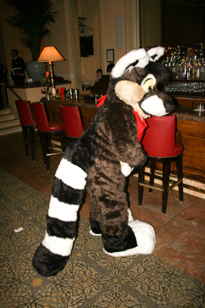 After surviving the parade and doing the group shot we stalked Croc a bit because he's so awesome. Went to room again and had lunch with Patches, Henrieke and Chorca at Johnny Rocket's. We ate in our room and watched TV. Went down again in order to art jam and tried to find Michael Fry and Thomas Lewis. We found out that they held a panel that was rescheduled from Sunday to today at 17:00. We arrived at 17:25 and Thomas Lewis had to leave earlier. We wandered around afterwards, met Gene Catlow and C_Eagle. Also Brian Reynolds who invited us to join him for dinner with Tracy, Cooner and 2 other guys. We went to an Italian place and I had caesar salad with Henrieke. We talked about space shuttles and had a good time. The restaurant was at the same place we watched princess and the frog at a few days earlier. Went back to the hotel and met ZotCoon, Trigger and Duncan. I drew a quick sketch for Duncan. Then we went to the mustelid party. At first only Duco, Emejn, Jesper, I and Henrieke were there. Later Kipper, Goldie, ZotCoon, AuraFox, PokitFox, the Brits, Spain, Ras, Tahoe, GatCat and his girlfriend (talked about thylacines with her) and others were there too. It got pretty full. I got sketches from C_Eagle, Gene Catlow, Emejn, Duco, Kipper and Hawthorn. I drew drunk ballpoint sketches for lots of people. Also a conbook sketch for AuraFox. Tahoe wore Sparky (awesome). The party was pretty awesome and the view from the 19th floor was fabulous!