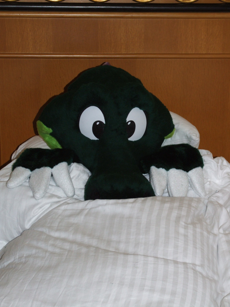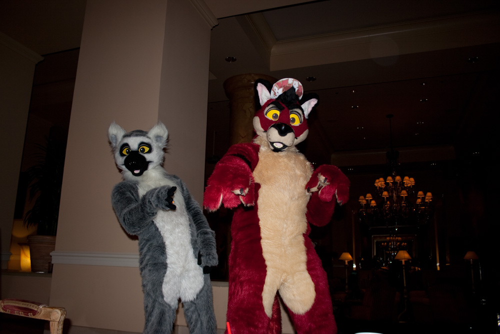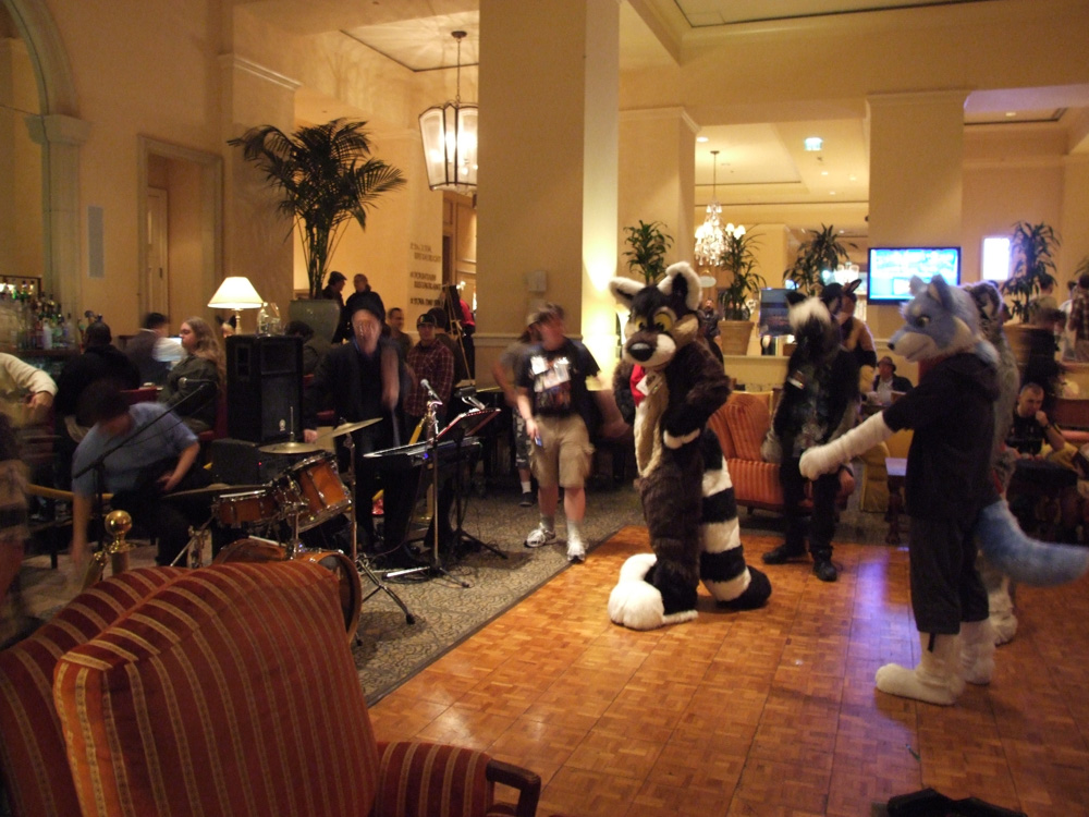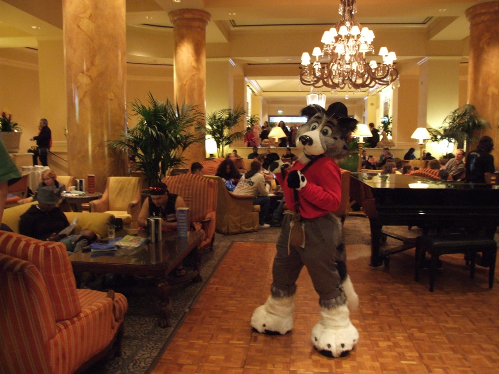 Henrieke left in order to go to the Sofawolf party later. We all went up to Blaez' room again where we watched tons of YouTube videos and listened to the Goofy Movie soundtrack and other Disney music (and everybody sang along). Went down again later for the fursuit dance which was fun, but we didn't stay too long. I got to our room again and got out of suit, I went to the Sofawolf party but it was over already, and Henrieke was in our room. We ended up hanging out in the lobby a bit with Bacon, Theome, Zot and Yippee.