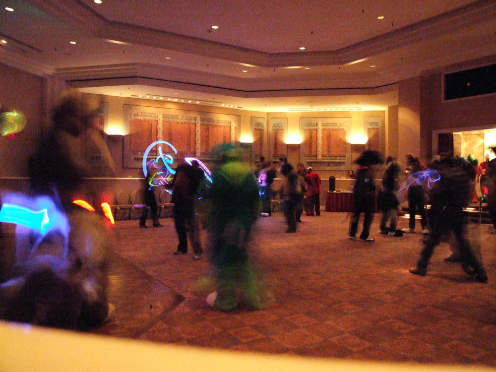 Back in the Lobby we met Matrices and Diadexxus, then Blaez invited us to his room and we checked out his suits and watched "Something, Something Dark Side" with Tally. We went to the registration then, and it took only 5 minutes. We met Media (who we also never met in real life before) and went suiting with him as Spook and Tally as Binx. There were some cute kids near the bridge to the South Tower who we interacted with. We also got to meet JD, yay. After suiting we went to Safeway at 21:20 and hurried since I didn't want to miss Croc's dance. We were really hungry, so we ended up getting a cheese pizza which was really disgusting, also some milk and fruits. Then I went downstairs to Croc's fabulous dance! The setup there sadly didn't do the music justice but still it was awsome.
