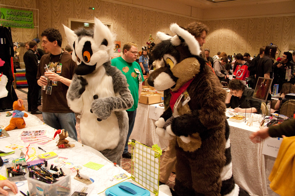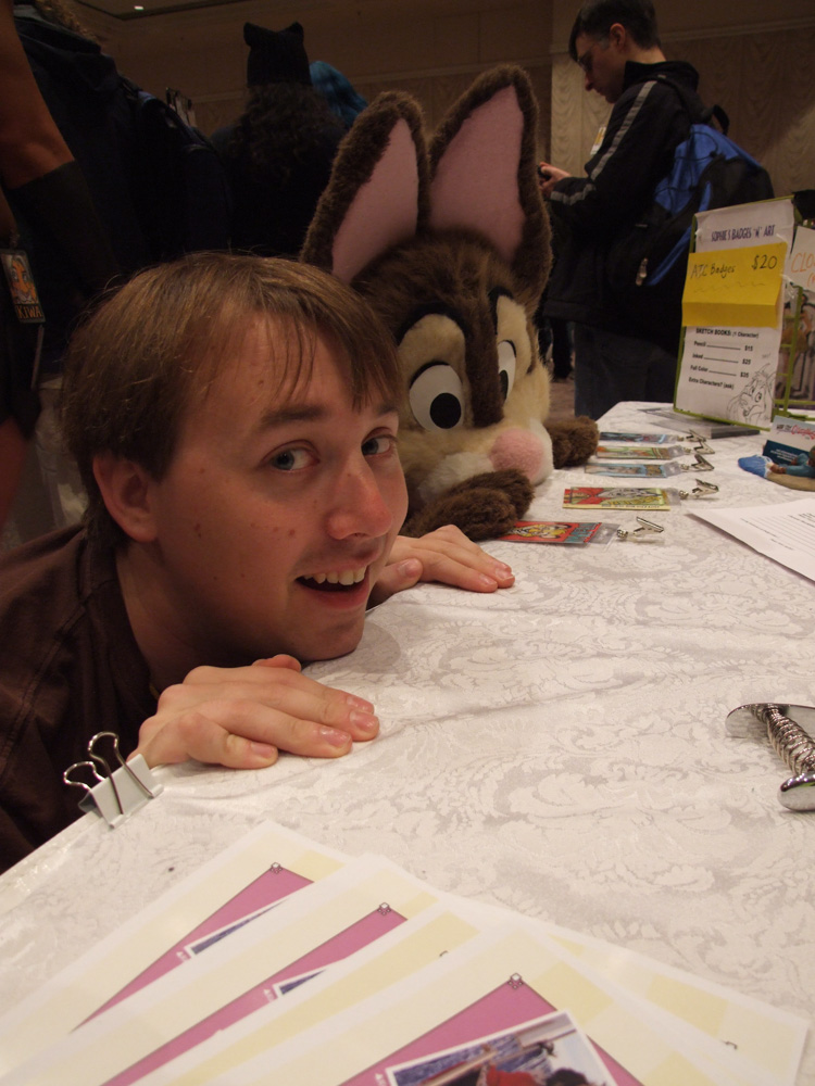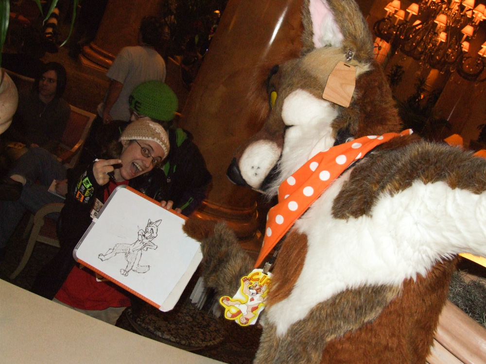 Ciro and Tyler went to the upper floor where the awesome dance was going on, I danced a bit but it ended very soon after that. We met Media/Spook in the fursuit lounge again and did PARKOUR. Also we met Matrices and Blondefoxy. Went to the lobby again where we picked up an awesome drawing Chad drew for him and drew him a duck in return and we went up to the room, with hardly anyone left in the lobby (Kipper, Chad, BBF, etc..). We discussed internet cartoons in bed and then passed out.