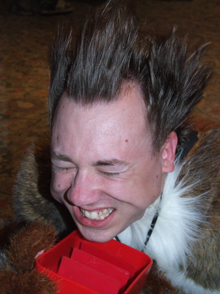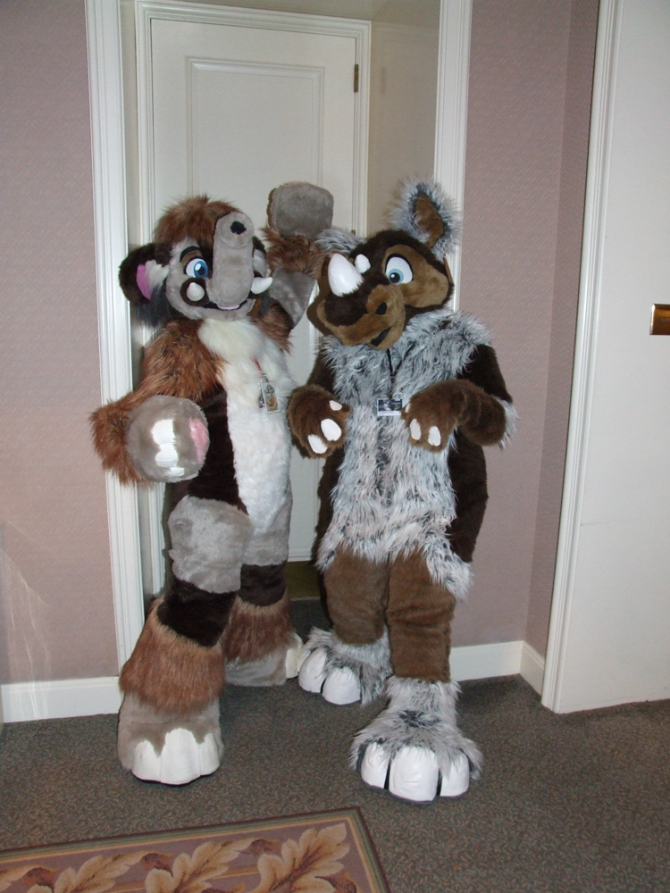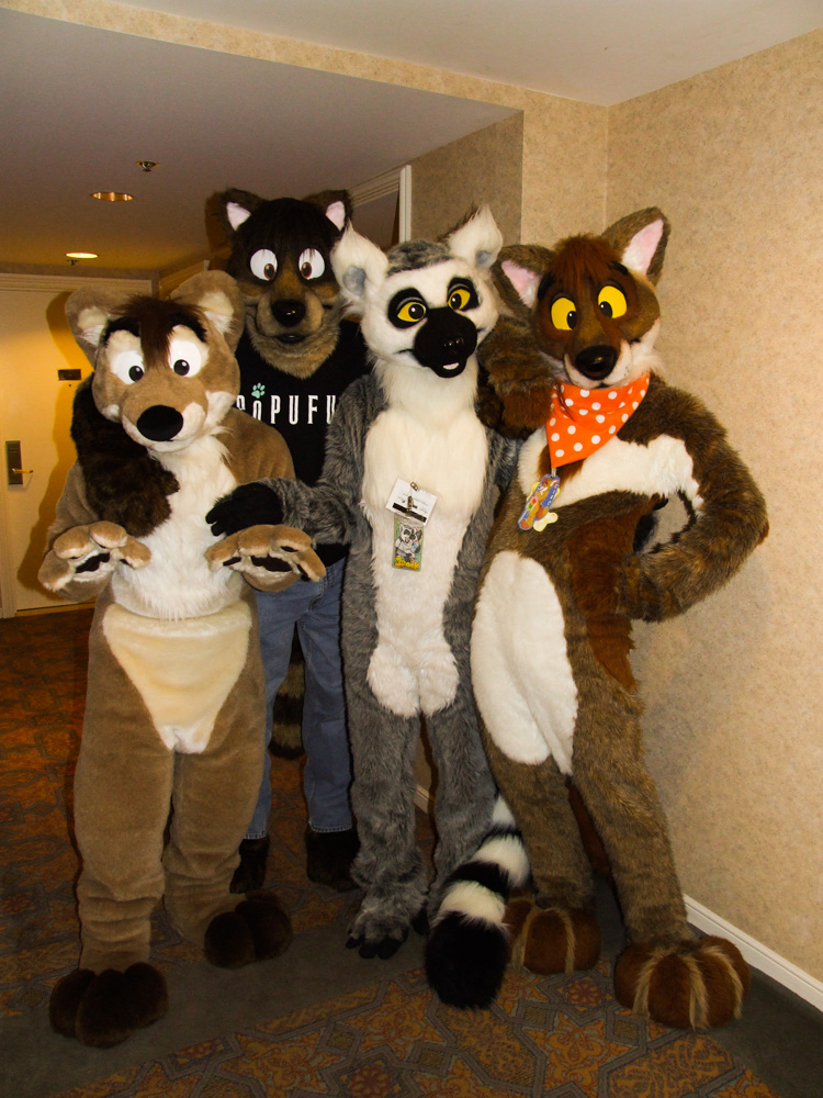 All of the suited more in the upper Level, I wanted to join with Ciro but then Chorca and his roommates went for dinner so Henrieke un-suited. I went down again and ended watching the fursuit dance compo, where I sat with Yagfox, Lothrek, Duco and Yarwick and watched Spook (awesome moves but meh music) and Pepper Pup (awesome moves and awesome music). Then went to Walgreens with Henrieke to get more milk and a refill for her prepaid phone. At the way back Chorca texted that he was ready for some fursuiting fun. Yeah! I bugged Chorca forever to let me wear Ciro, eventually he said yes, so we went down suiting (me as Ciro, Chorca as Tyler, Spook and Zot). SUPER AWESOME!