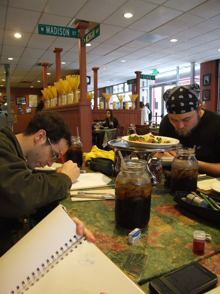 We got up at 9:30 and hurried downstairs to meet Michael Fry and Thomas Lewis. Michael Fry left already, but Thomas Lewis thought of us and already drew us a sketch in advance, that was so awesome! When we told him we live in different countries, he even drew another sketch for each of us. Then we went to Dealers Den, met Jimmy and Doodles. Also RedXIX, the awesome guy who built Kootenay. Then I met Alexandra, a friend from Austria who jad moved to the U.S. about 2 years ago. She was leaving already but it was really nice to see her again! We had lunch with Kipper, Goldie, AuraFox and FerretParade. First we ended up in a super-loud sportsbar, but then found a really good Chicago-style pizza place.