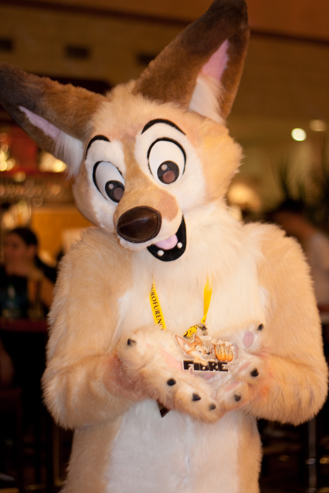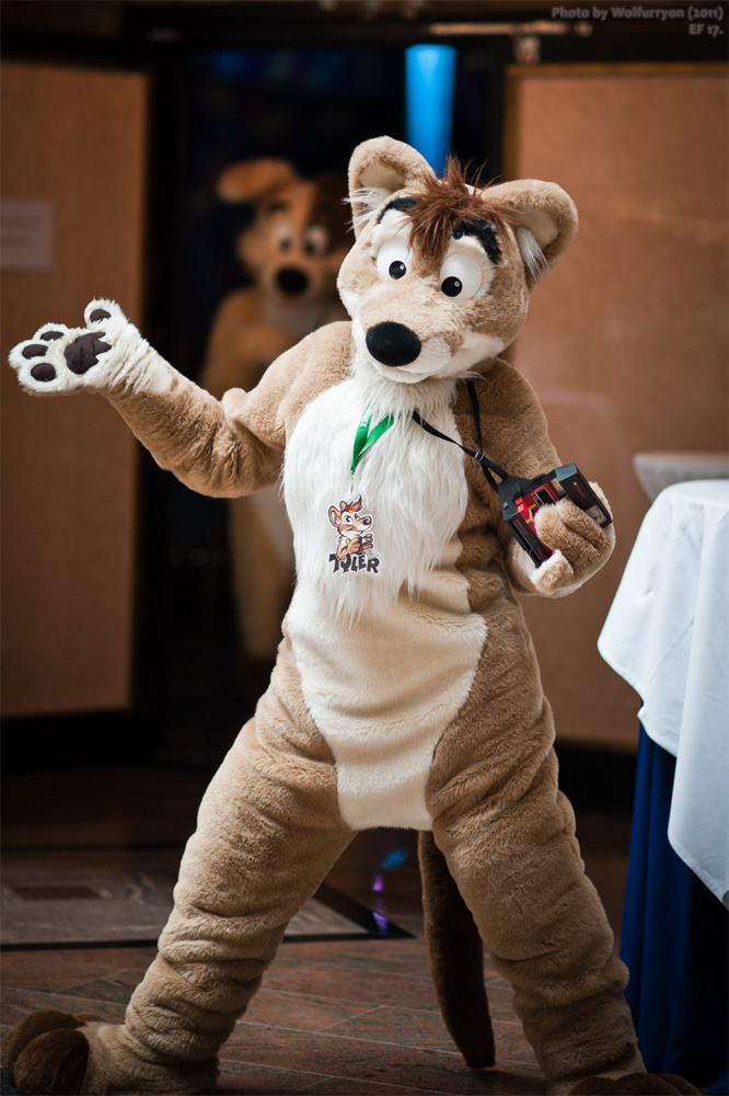 We suited up then and went downstairs for the group shot, the fursuit parade was almost canceled due to rain but eventually took place. However, since Tyler shouldn't get his feet wet, he and Dog stayed at the hotel. After a short break, we suited more. There were dozens of reporters in the lobby, and eventually Dog and Tyler caught the attention of a camera man outside the hotel.