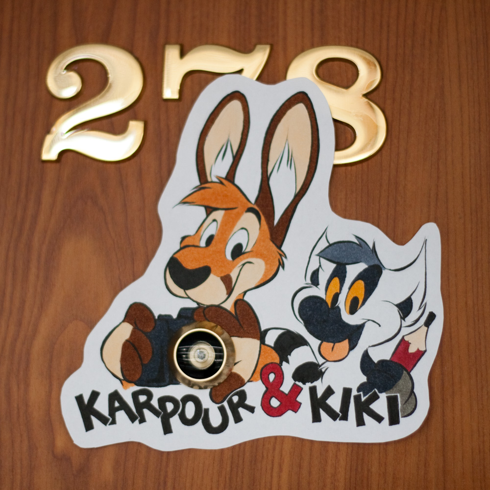 Got up at 10:00, had relaxing breakfast, sat in the lobby and drew stuff. I did a badge trade with Neo and I did a collab badge with Henrieke for Loewi. Also, we started working on our roomsign. We already had that idea last year, but this year we finally pulled it off! Someone hung up an awesome poster which immediatly separated the men from the bronies.
