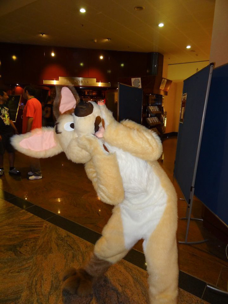 Then we went to con-ops to get Henrieke's lost cam and took a Polaroid photo of Titash. Afterwards we went to video puppeteering workshop with Jim Martin which was really fun and interesting. We went once again to subway for lunch, this time with Cody. Later we sat in the lobby at the table with Davuu and C_Eagle. Since I felt like suiting, I got Dog, who was running around in the lobby, spending most of the time pushing people to the charity desk and making them buy stuff.