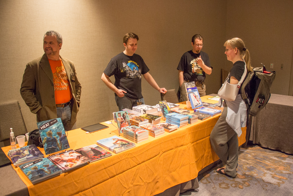 Had breakfast at Starbucks, a way less fancy experience than in Austria. Then went to the Dealers Den to say hi to everyone we knew, mostly annoying Louve and Booboo, also meeting Stigmata who is a real artist. Henrieke's book was on sale at the con, giving us the first chance to see it in real life!