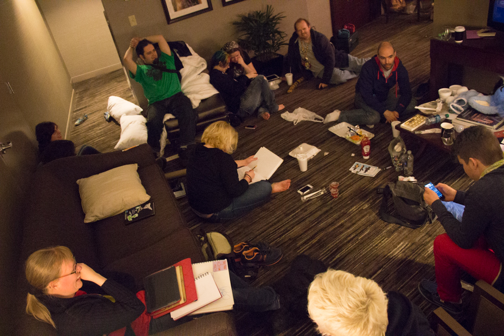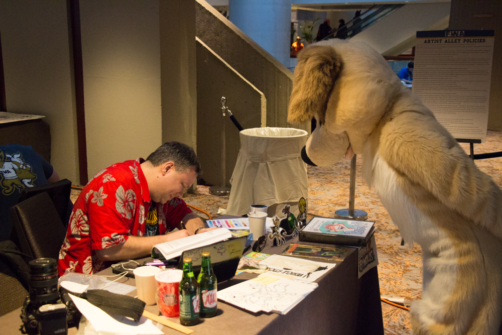 We went to the Artist Alley after that and got some lunch at Dunkin Donuts with Louve. Back in the hotel, we ate our unhealthy American food and I drew my part of the trade with Mehndi. We went to Stigmata's "Try Harder" Panel and after that wandered around between Dealers Den and Artist Alley. Henrieke, I and Zahzu sat there for a while and I got a Domino's personal pizza. I don't know how they did it, but they managed to mess up a pepperoni pizza. I will eat a pepperoni pizza in any form, thin crust to deep dish, but this was just a sponge made of dough that was completely soaked in fat, with some gross cheese and pepperoni on top. I felt sick after eating it.
