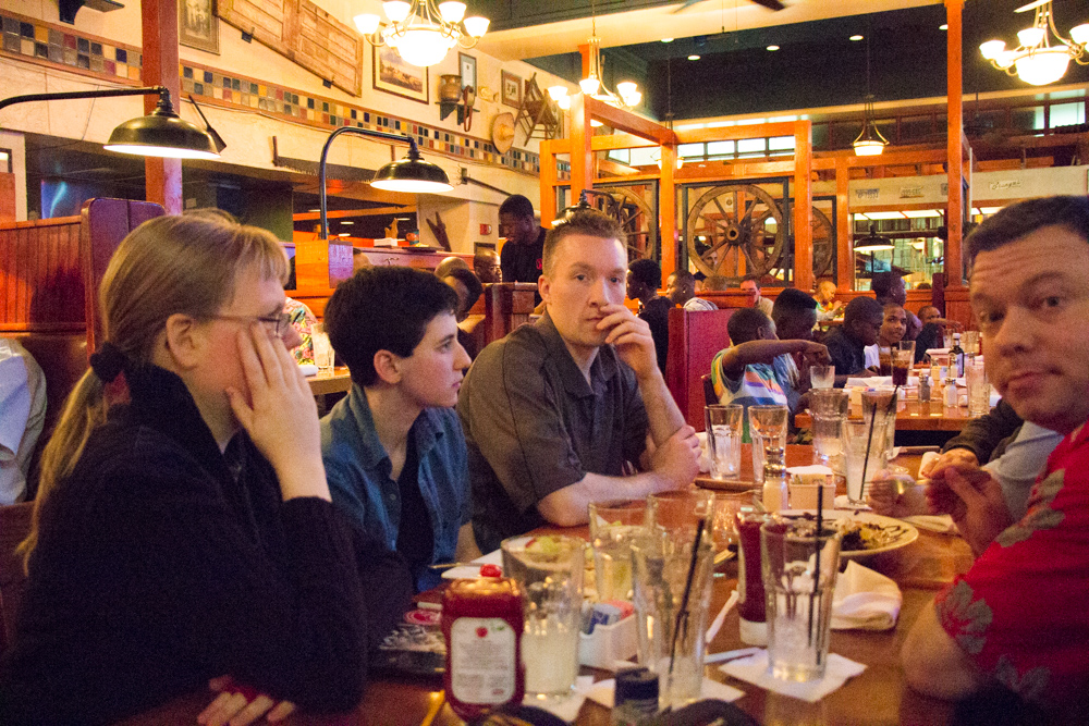 Since Henrieke did something to her elbow prior to the trip, our first stop today was a doctor, which naturally meant filling out lots of paperwork. The doctor did suggest that it might be a dislocation and wanted us to go to an emergency room, but since that would mean tons of paperwork, spending half a day there and paying a 4-digit amount which would probably reached my credit card limit, we decided to just see of the arm sling, muscle relaxers and painkillers would help for now. We picked up our medications and other stuff for the con at Walgreens and then had lunch with Chris, Kanu and Scott at Fresh2Order, pretty tasty and absolutely amazing wild mushroom soup! It took a while to get to the (massive) convention hotel due to rush hour traffic, but we made it eventually. The hotel the convention was at was the Westin Atlanta, the tallest hotel in the U.S.! After waiting a bit in the Lobby for Nicole, our roommate, we got to our room in the 5th floor which granted us a wonderful view over Atlanta and far beyond the city borders. The first event of the con was the opening ceremony where we already met Louve, Booboo, Foxjump, Clawed and Sapphire. Louve was the guest of honor, so we sat there and watched her sitting on stage in all her glory, silently cheering for her. Right afterwards, there was the GoH meet and greet panel where Louve answered questions mostly about horses. We all then went to Metro Diner, a restaurant we've already visited in 2011, except this time with horrible karaoke in the background! We enjoyed the dinner a lot though, drawing a bit while trying not to fall asleep due to jetlag.