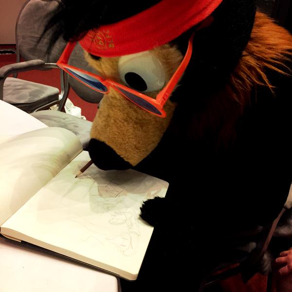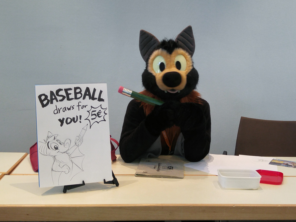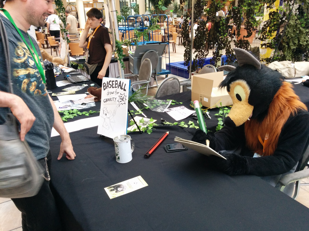 We went down at 9:50 and had breakfast with Birko and Spikie. A bit later, Pinky came and hurried to get us to the charity team photo shoot which we completely forgot about. We did some fun poses and went back to breakfast. Henrieke went to set up her dealers table again and I got into Baseball and sat in the Artist Alley a bit, doing doodles for donations.