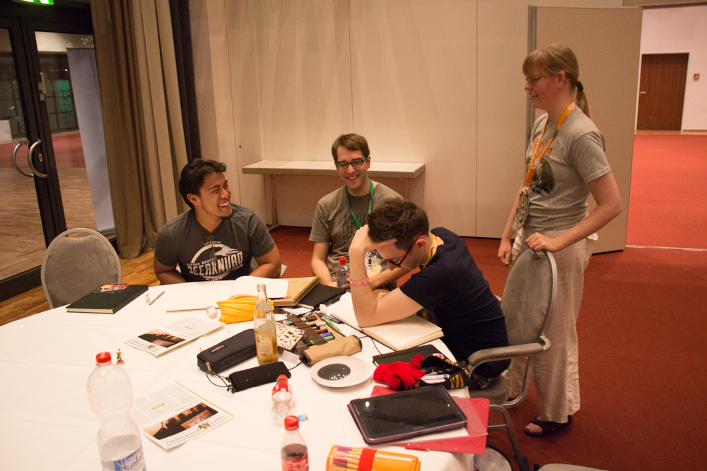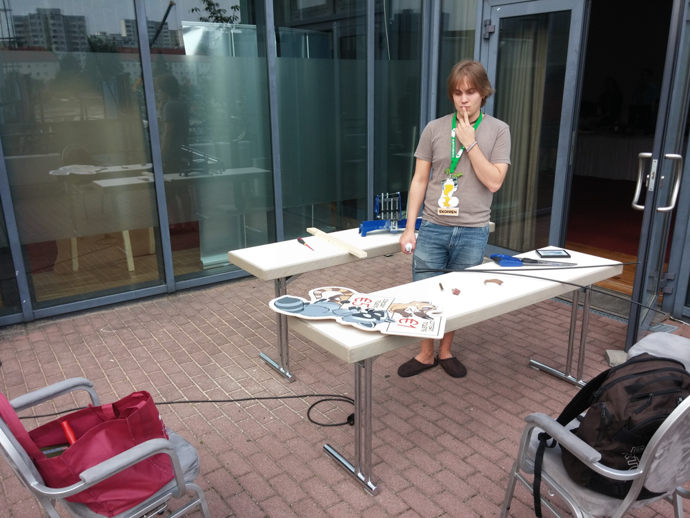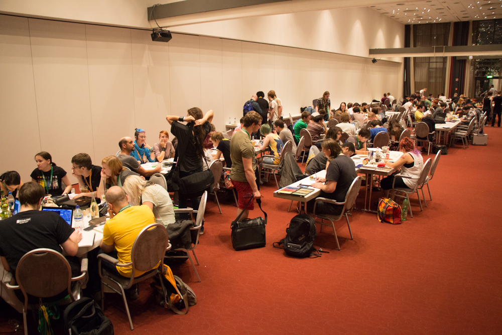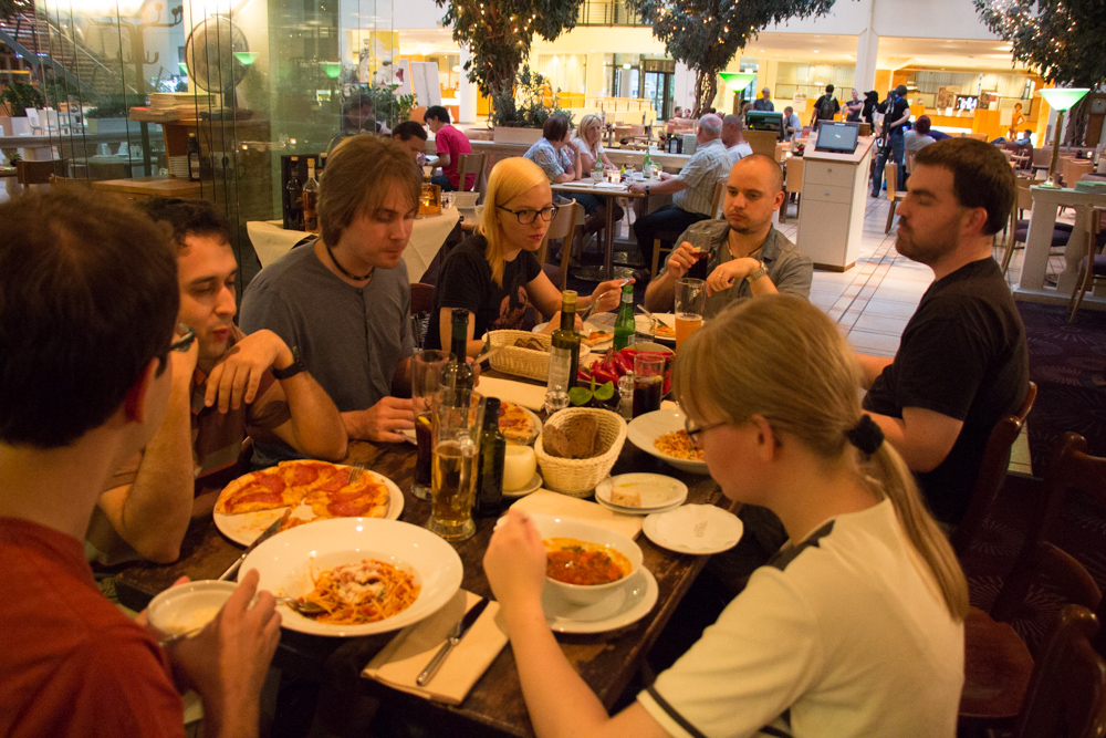 Henrieke and I had a little chat with Kalaallit who gave us some free Club Mate he brought from CCCamp which took place directly before EF this year. Today we decided to have dinner with some people we don't hang out with enough, so Henrieke and me went to Portofino and had dinner with Chiros, Oddity and Tifou. Afterwards we went to the Artist Lounge and also sorted out some issue with Tabbie's and Mag's room door, basically you could just push it open from the outside which was a bit worrying.