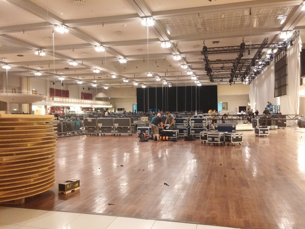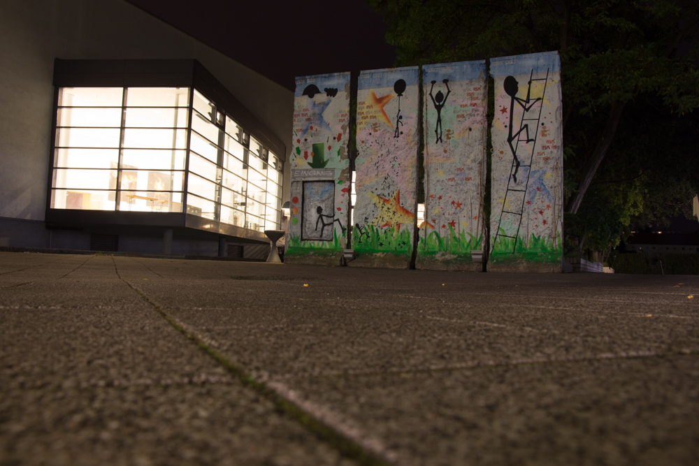 After dinner we wandered around in the Estrel Convention Center a bit, looking at the 40+ crew setting up the giant stage. We sat at the outside area of the hotel which featured a piece of the Berlin wall and chatted.
