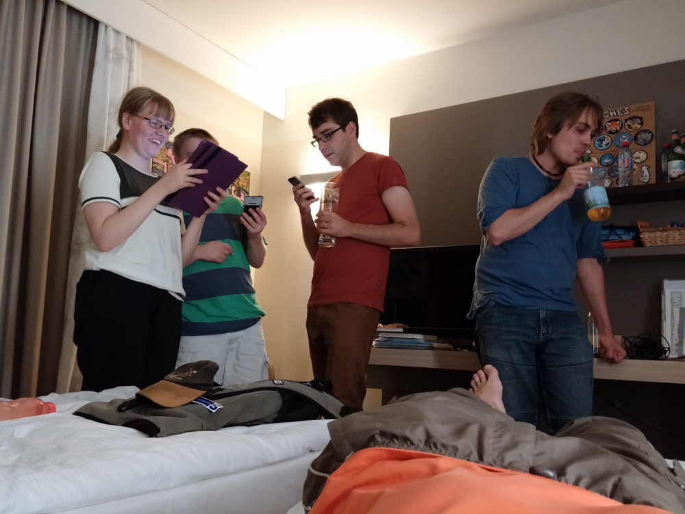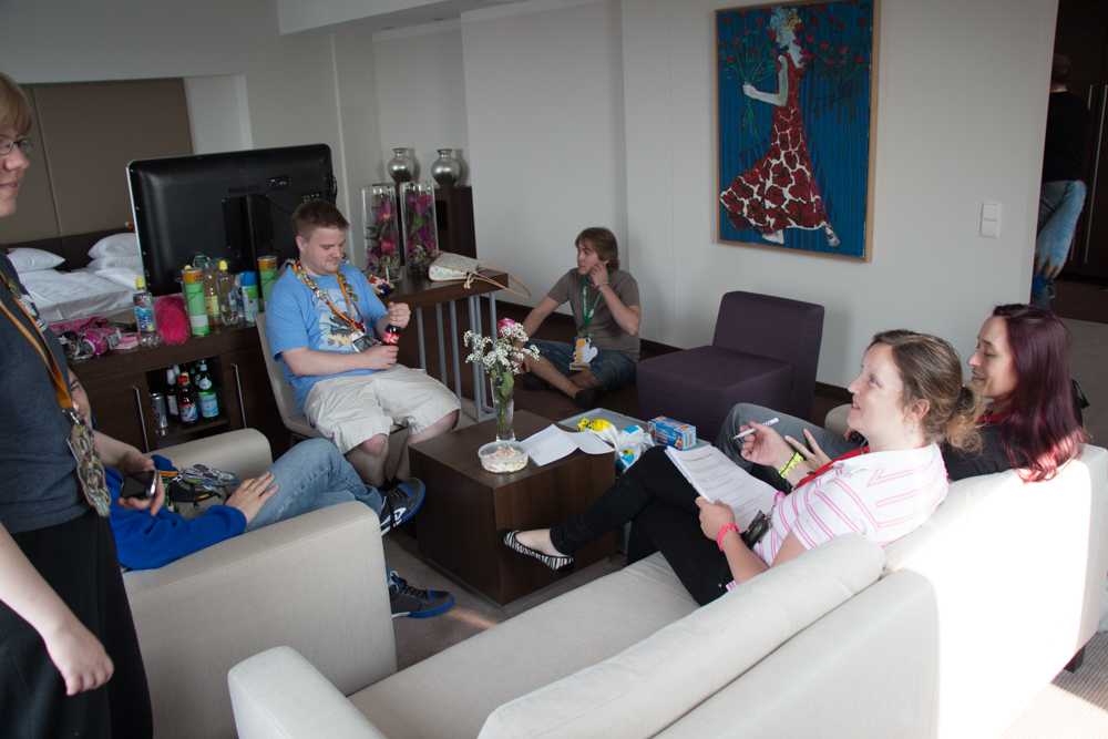 Allergy hit me hard that day and at 12:45 I went to the room to steam a bit. As soon as I felt better, we finished setting up the charity booth and went to the charity team meeting in Pinky's junior suite, offering an amazing view over Berlin. Ekorren also joined and listened!