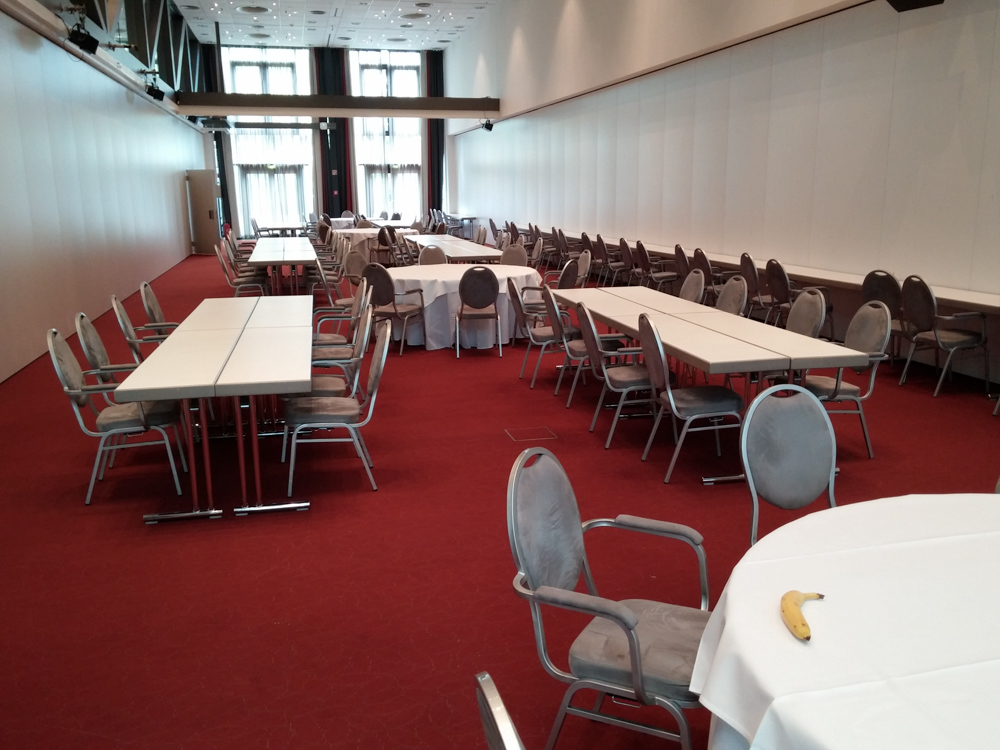 I spent some time talking to what appeared to be the owner of the place about Eurofurence, trying my best to explain what was going on in the Estrel while waiting for my wurst. Back at the hotel we met Sithy, who generously lent us some supplies like military vests and ammunition boxes as decoration for the lottery booth. I ordered some tables from the hotel, which were apparently scheduled for the wrong day and assembled the aluminium frame with help from a few friends. Sadly the measurements were wrong, so we had to disassemble the whole thing again and postpone the setup of the booth until Djem was able to adjust the length of the aluminium poles again.