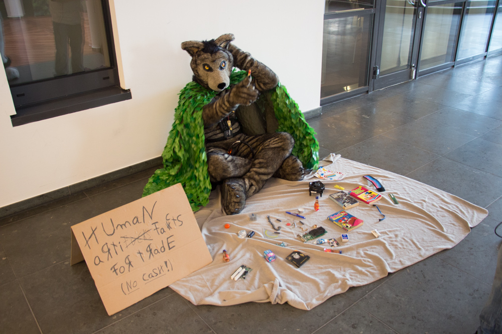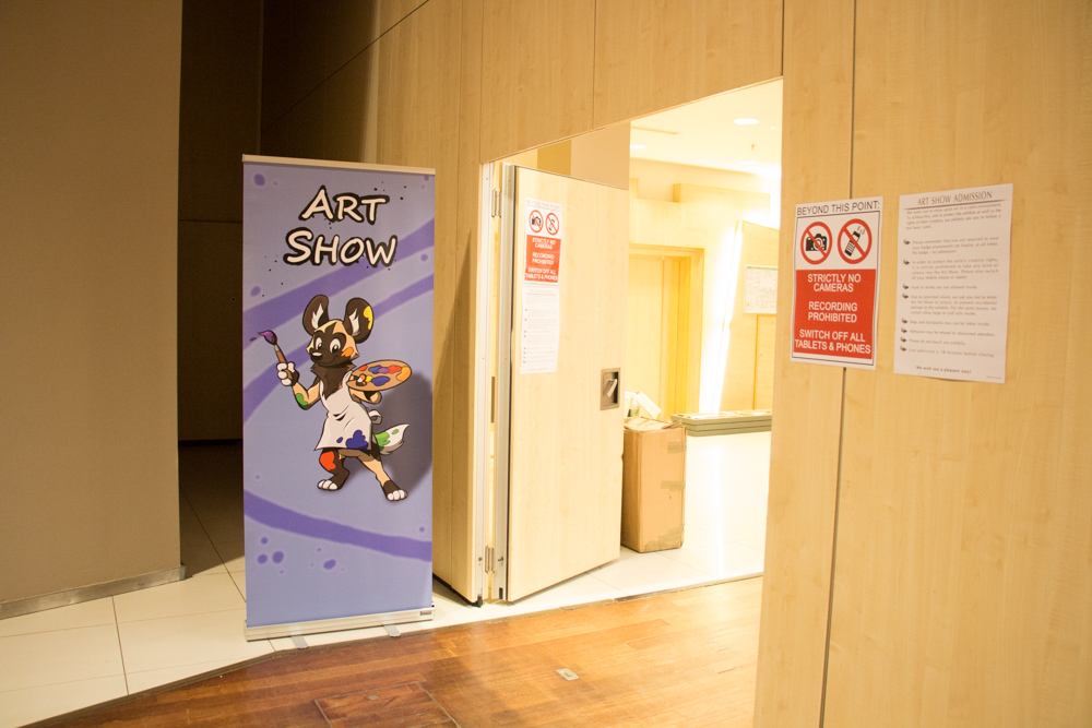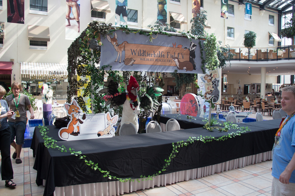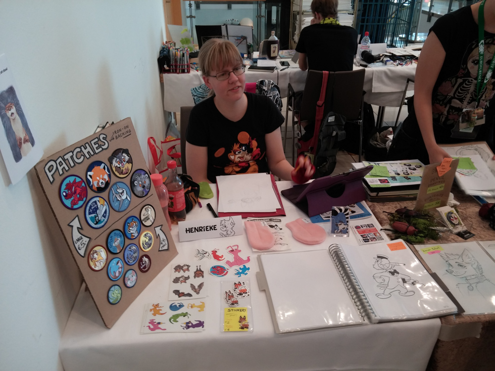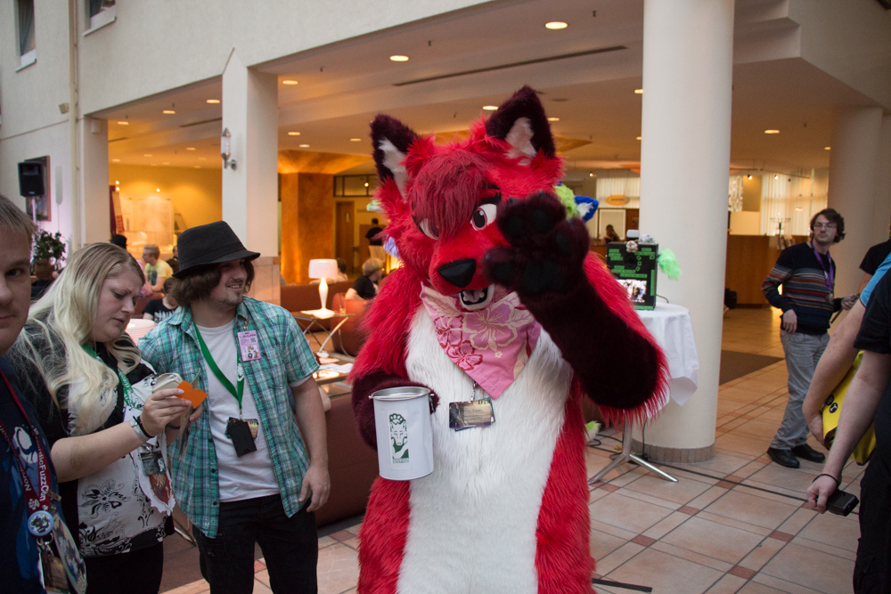 We got up at 9 after the room service tried to get in 3 times already, we should definitely not forget the Do Not Disturb sign next time. At breakfast we sat together with Lanakila and had a nice chat, Yotie and Ekorren joined as well later. Afterwards we went to ConOps to sort out things for the charity booth and went to get our con badges at registration from Akuro. I picked up a package that was sent to Henrieke and me by Lance, containing some art supplies to try and a remote control for a quad-copter that was meant for the charity auction, sadly the matching quad-copter didn't surface. Henrieke took a shower, I watched Djem assemble the booth and Ekorren picked up Dog's head (that sounds terrible out of context) in order to get his fursuit badge.