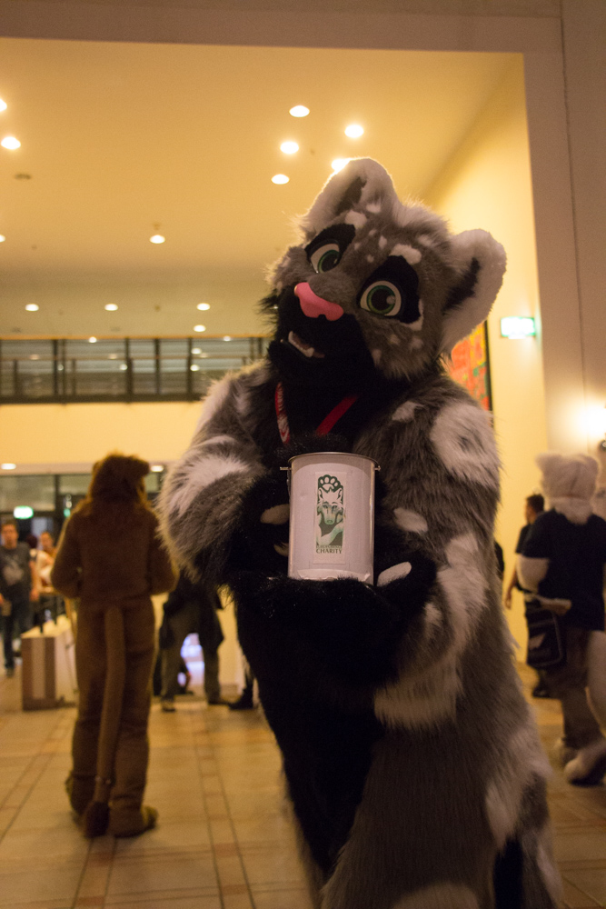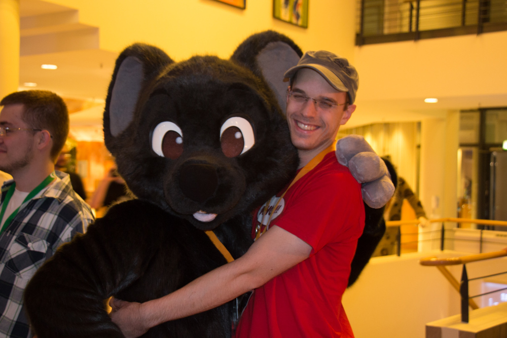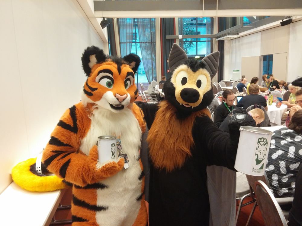 Baseball went to the Dealers Den for a bit and said hi to LuckyCoyote, then I got out of suit with help from Wikke. I went back to the Dealers Den, met Sambers and Dibs and rushed back to the room to get the Balaclavas I brought for them. I sat a bit on the floor behind Henrieke's and Lisa's table and wrote a bit on this very report. Then I went back to Mag, who was still sitting in the Artist Alley and asked him and Eko if they wanted to suit in the Fursuit Parade. We got out Tyler, Dog and Baseball and Tyler managed to film parts of the parade while Baseball collected money for charity. After the parade we all got out of suits and I got some lunch for Henrieke and me consisting of Currywurst, Estrel Fries and Chicken fingers. I helped Henrieke pack her stuff because the Dealers Den closed already. Outside the Den I ran into Nwar, a french artist I commissioned earlier, and got my sketchbook back. We finally had "lunch" at one of the round tables outside the main stage. Henrieke and I quickly went to see how the bids were going while the others guarded our bags. I ended up bidding on Henrieke's otter painting through Yotie. We went back to the charity booth to see how things were going, had a little chat with Rosi and saw some strange people arrive in the lobby. It turned out to be a "Comedy Tour" of Berlin, with hosts dressed up in drag, that made a stop at the Estrel to point out the weird furries. We quickly took the chance to get some charity donations out of the tourists as the booth was basically the first thing people would encounter in the lobby. I quickly tried to find a suiter, one of them turned me down as he was afraid to miss his DHC photo shoot, luckily Faith, who was waiting for the same photo shoot was nice enough to help out the charity and collected a bit of money.