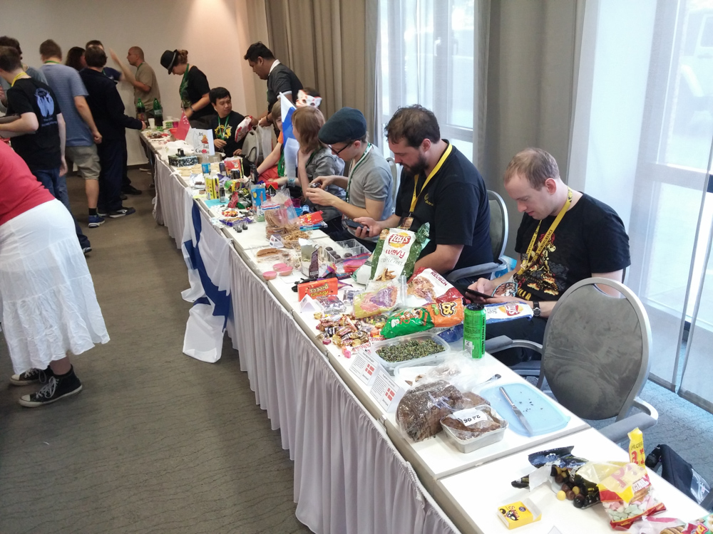We got up at 9:30, had breakfast with Ekorren and Coora. Afterwards we had to fix up the charity booth since some drunk people last night sat on it, pulling off half of the table cloths. I went to ConOps and asked for some signs asking people not to sit on there. Afterwards we got our snacks together we brought for the International Snack Exchange, pretty much the best panel at EF. There was a great variety of stuff to try including lots of thing containing salmiak on the Finnish table which I gladly avoided.
