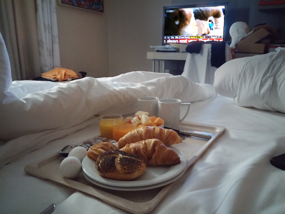 I got up at 10, went to the breakfast buffet and brought some stuff for me and Henrieke to our room. I went back to bed then, tried to sleep for another hour and then got up with Henrieke to have some breakfast in bed, watching EF Prime like in the Maritim days.