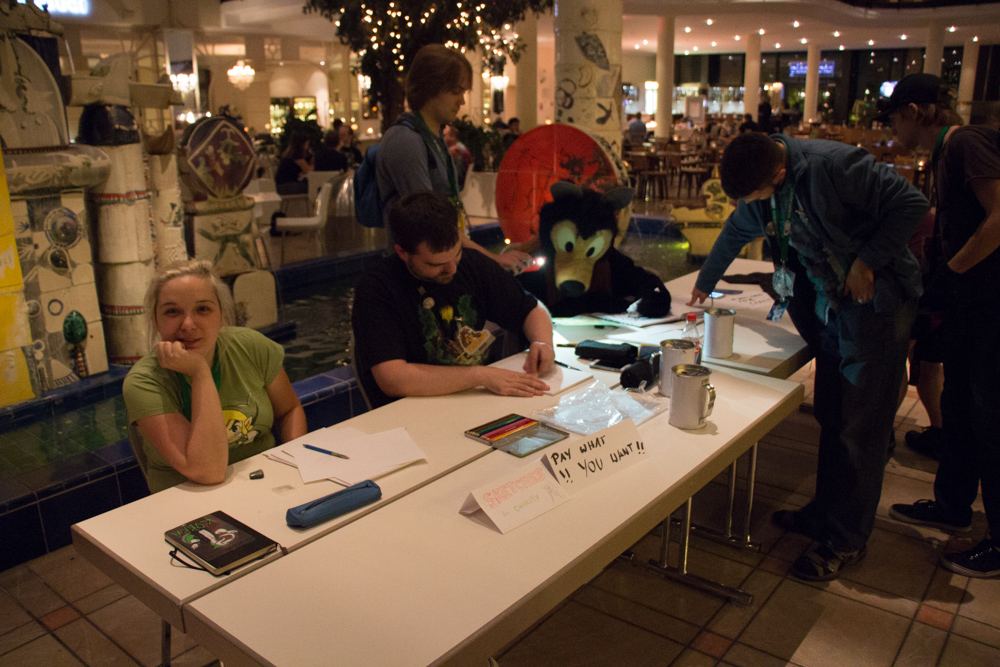 Eventually Pinky came back, I went up to her room to look for my lost bag, sadly still nothing. Baseball was just about done with making drawings for donations, so I took his place and also did some more PWYW drawings until Henrieke was done taking a shower. When I was done, I went to check out the dance for a bit, then went to the Artist Lounge to do a trade with Pegla for giant googly eyes. Pinky dropped by and asked for help with counting coins, Henrieke and I ended up doing that in the security office until 1:00. I went to check out the dead dog dance a bit again and sat in the lobby with Ekorren, Henrieke and Frazzle.