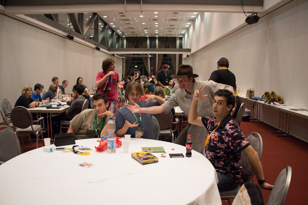 We had breakfast with Trax and Emejn and almost spent 2 hours at the table, talking about things like convincing Louve to come to NFC. Eventually Henrieke had to leave to the Dealers Den and I joined her later. I got us some lunch from the Estrel Bar again and then got Baseball down to do some drawings for charity at the charity booth, which was empty since Rosi left the evening before.