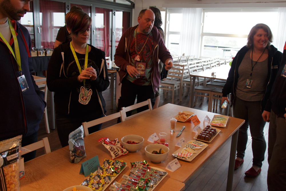 We were back in time for the opening ceremony, which was opened with a very confusing and catchy "Cheese Party" music video, composed specifically for NFC. Silverfox was introduced as Guest of Honor and Mausie was being cute as usual. We went out early to prepare our little section of the International snack exchange, an event where attendees bring snacks from their home country for tasting. Ekorren organized it and it was a big success, with many tables being filled with tasty and weird snacks from all over the world.