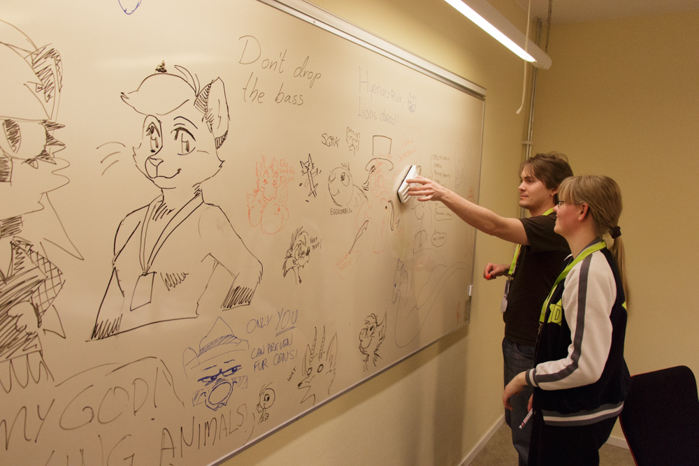 I went to have breakfast shortly before the buffet closed with Ekorren, Kenai, Louve, Clawed, Jill and Shannon while Henrieke preferred to stay in bed. I got down Henrieke later and we spent a long time sitting in the corner next to the registration office, doing a little art-jam. Trax asked me to draw a very quick commission to give to NewEinstein since this was his last year as chairman, so Henrieke and I collaborated and finished just in time before we went to the closing ceremonies. In the closing ceremony, a 28000 SEK preliminary charity amound was announced as well as a new location, the Scandic hotel very near to the Arlanda airport with the theme being Japan.