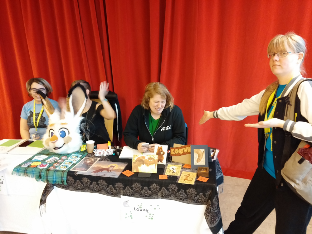 We had breakfast at 10:30 with Sithy, Okill and a few others, sadly I had a headache that would not go away. Henrieke and me went to the Dealers Den, but since my headache was very annoying I went to the room at 12 to rest for a while. An hour later, I went down to the lobby and met Birone, who brought along his dad and sister, who both very much enjoyed the con. We went to the art show to check the bids and to the Dealers Den where Henrieke got the new art book by Silverfox.