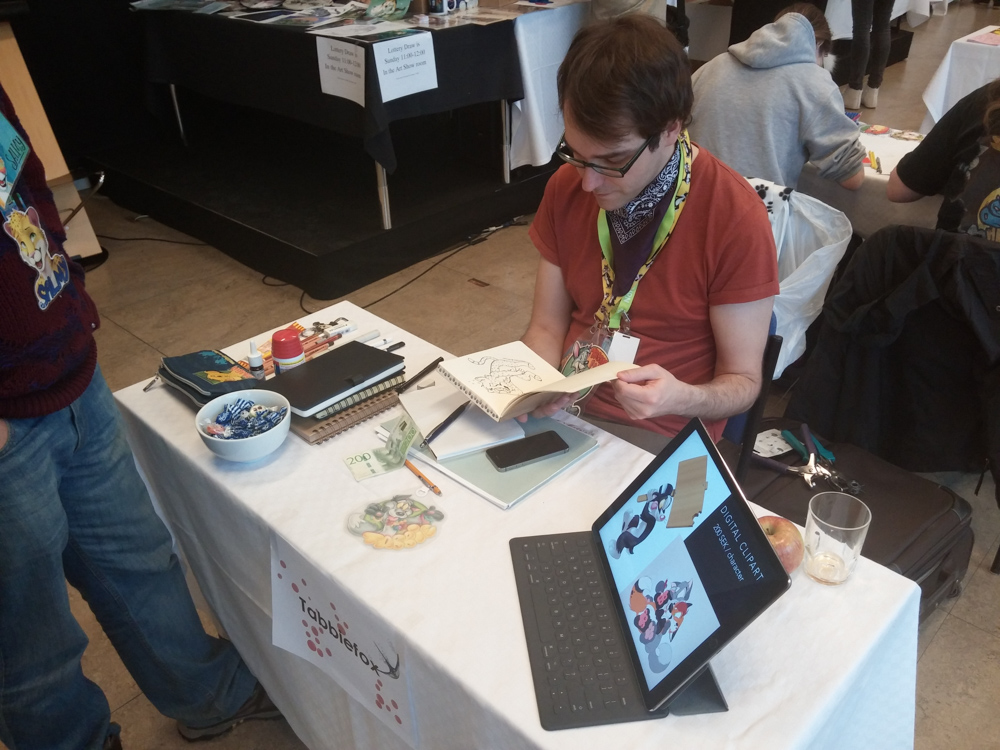 I woke up without headache and appreciated how nice that felt. We had breakfast at 10:40 with Titash, Procyon, Ekorren and Jill, then went to the Dealers Den. I hung out at Tabbie's table for a while and tried to persuade him into accepting a commission.