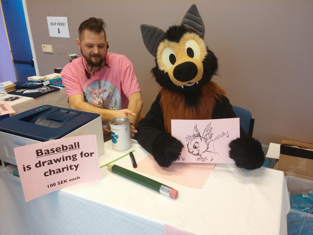 I also managed to commission Louve. After having a little chat with Shorty, who ran the con store, Henrieke got Baseball down, who sat at the entrance of the Dealers Den and did about 15 drawings for charity at 100 SEK each.