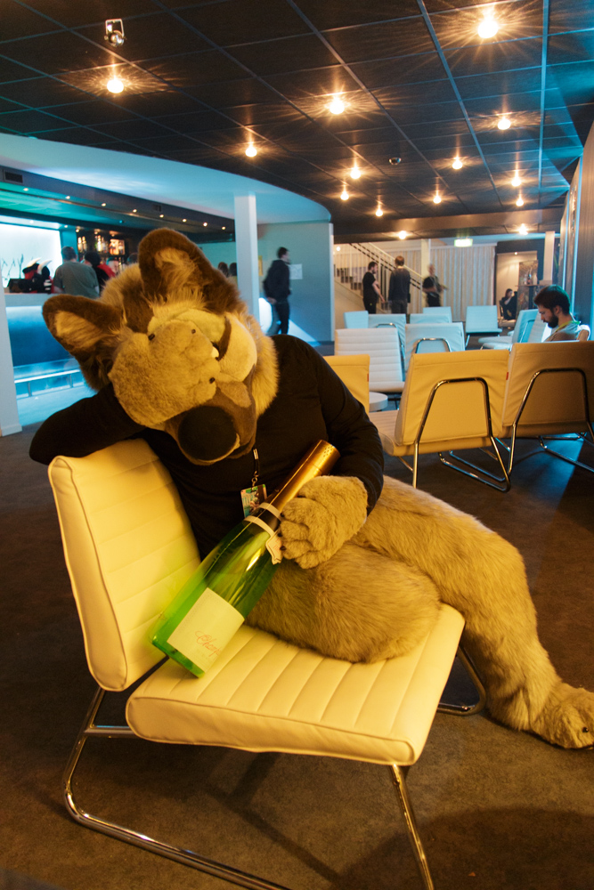 I flew to Amsterdam where I met up with Henrieke. Since we had quite some time, we went to look for the latest Eppo issue which contained drawings by Henrieke, sadly no shop had it. At the gate we already met about 6 other furries since this was the most logical flight to take to NFC for dutch people. We had a smooth flight during which I worked on my laptop, finishing up the scans of a Brer Rabbit comic Henrieke drew. At Stockholm-Arlanda, we met Slycat and a few other furries who were all going to take the FuzzBus (a bus directly going from the airport to the convention hotel, a 2-hour ride). Since there was plenty of time, we had a quick lunch at Max Burger at the airport. The ride to the hotel was convenient and nicely organized, and I worked a bit more on the comic pages. At the hotel we met many friends, including Yotie and Ekorren, but the night was rather uneventful as both of us were extremely tired, with me having had 4 hours of sleep the night before and Henrieke exactly 0 hours. We bought some snacks in the hotel for dinner and went to bed pretty early to recharge our batteries for the con.