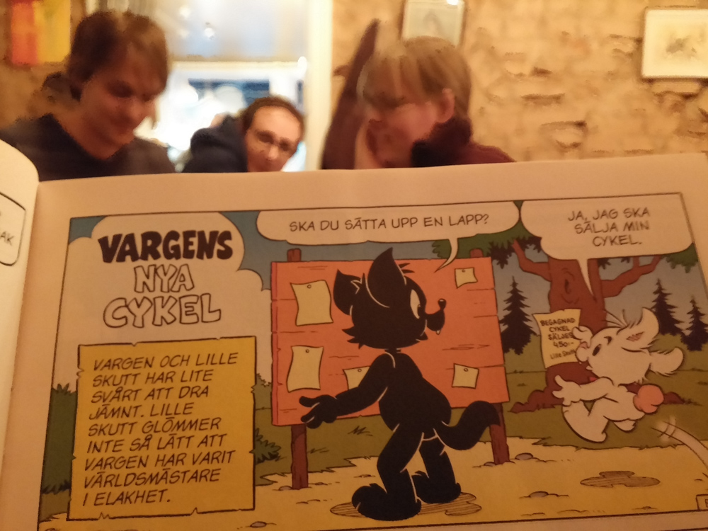 We got up at 9:00, had a quick breakfast with Sithy and Okill and went back to the room to pack the rest of our stuff. After some confusion, all of us managed to get on the FuzzBus that went to the central station. The Americans went to their hostel in Gamla Stan. Henrieke, Titash, Ekorren and I went to "Best Western Kom" around 20 Minutes walking from the station. We got a really nice little room! We all met at Max at 14:00 for some burgers, then walked around in Gamla Stan. We found 2 nice comic stores and Henrieke even managed to find 2 IDW magazines with her drawings in it. I ended up buying a Bamse issue thanks to Vargen, the adorable black wolf. While waiting for meeting up with the Americans again, we sat down for a coffee in a cute little coffeehouse and talked mostly about comics for a while.