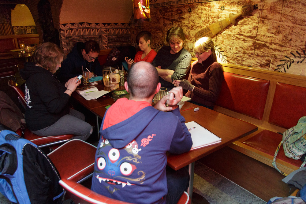 Back in the drawing corner we did trades and had a good time until dinner. I paid the dinner buffet, which was "Scandinavian Specialties", sadly it was very disappointing, especially the salmon that was completely drenched in lemon juice. Ekorren and Shannon got some Pizza, we joined them after dinner in the lounge above the lobby. I went to the room to pack a bit already, then down to the Dead Dog party.