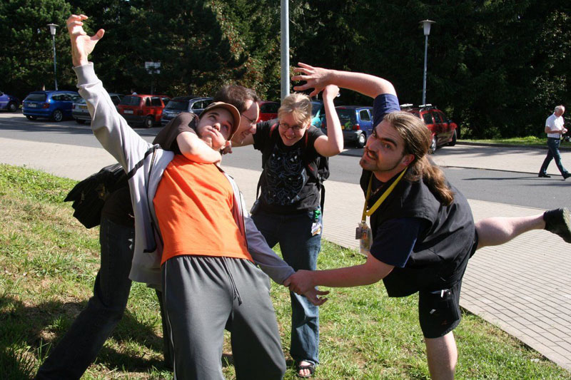 We barely made breakfast since we didn't realize the buffet officially closed at 10 today. At 10:30, we scraped together some leftovers before the hotel staff removed them. We sat in the lobby a bit, pondering what to do and quickly deciding to go to Tierpark Suhl, the local zoo. We said good-bye to Yamavu and Yotie, who had to leave already and recreated a photo we took back at EF 15.