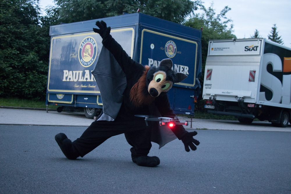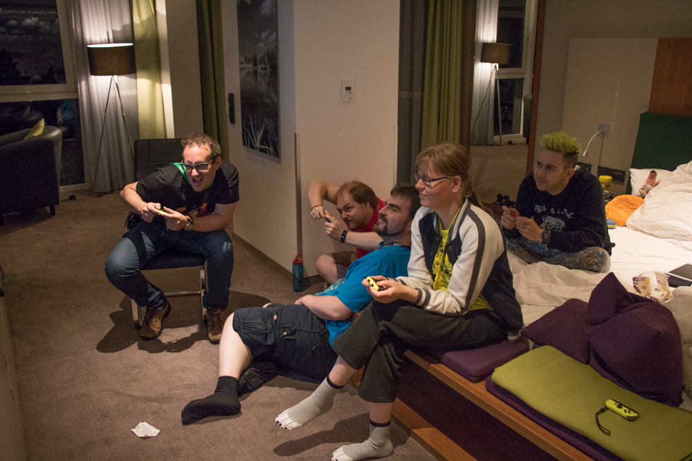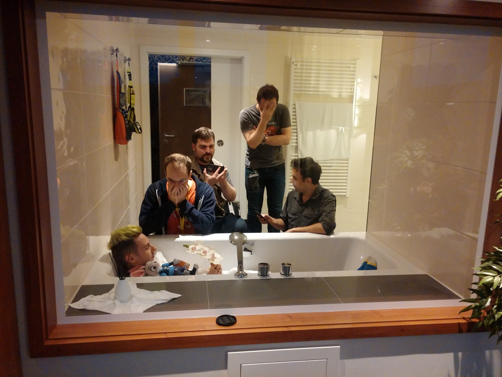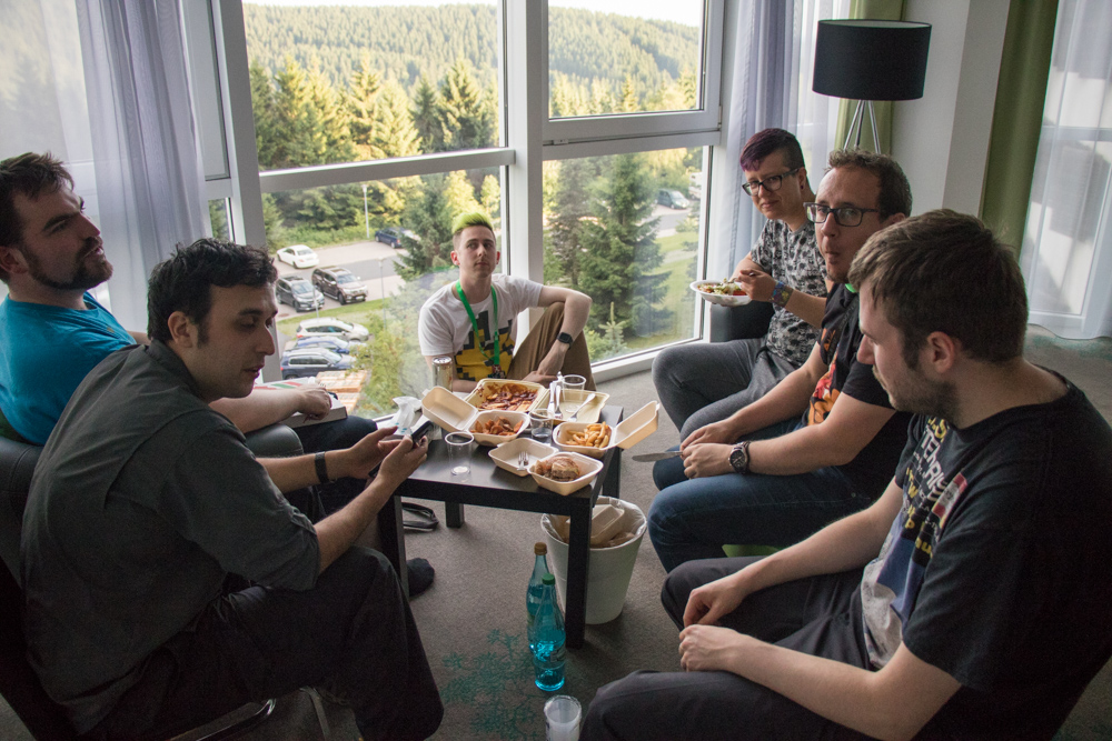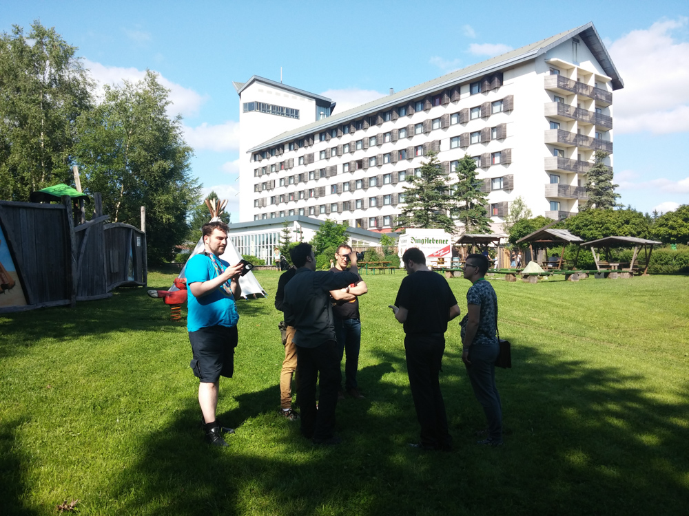 After walking around a bit in the town, we drove off to Suhl, which was about a 3 hour ride. We stopped at Rewe to get some takeaway lunch and then went to the hotel, where Krauti welcomed us. I also ran into Shorty and BBF in the lobby right away. We put our stuff in our ridiculous suite where the bathroom alone was the size of a small hotel room! I unpacked a bit while Henrieke lied down to rest a but. I went down to get our con badges and met the others outside. Yotie brought a DJI Mavic Pro, an insanely advanced drone.