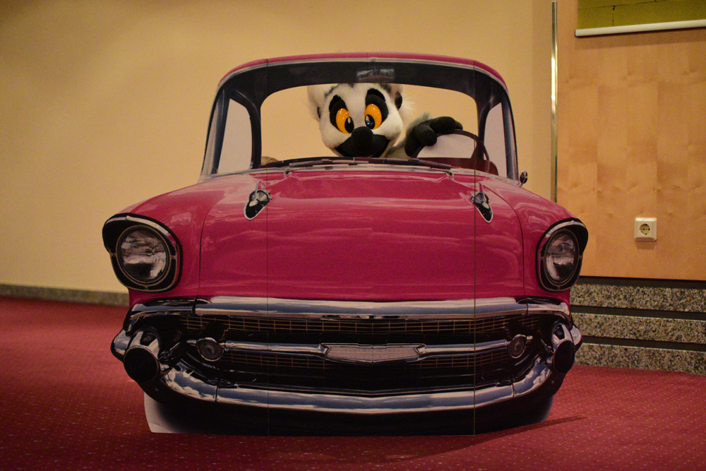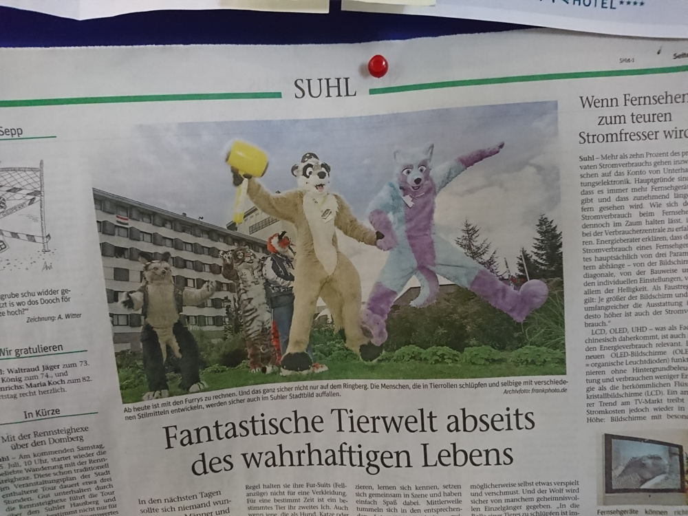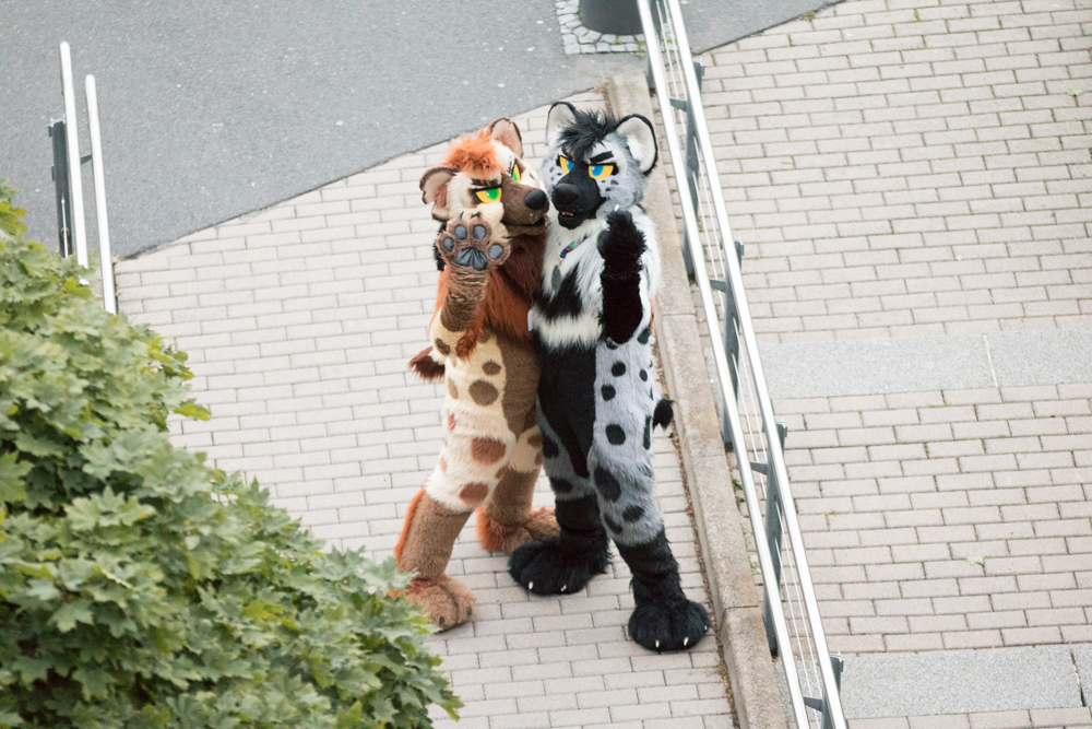 We also unwillingly became the information desk for many old people who asked about when and where the fursuit parade would start. We realized a bit late that the parade was due to start an hour sooner than we thought, so we quickly packed up, went to the room and got dressed for the occasion. Dog and Baseball came down, 15 minutes late but just in time for the parade to start. It started off with a group photo in front of the hotel, surrounded by lots of locals who came up to the Ringberg just to see the parade. Thanks to the good work of the press department and 2 newspaper articles prior to the con, the local people all knew about this event!