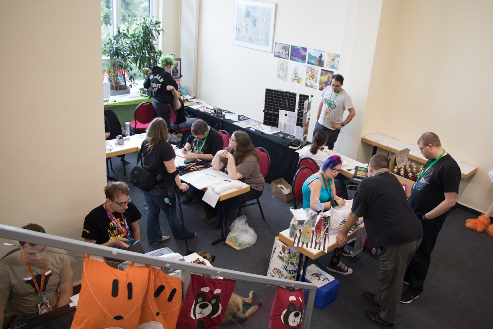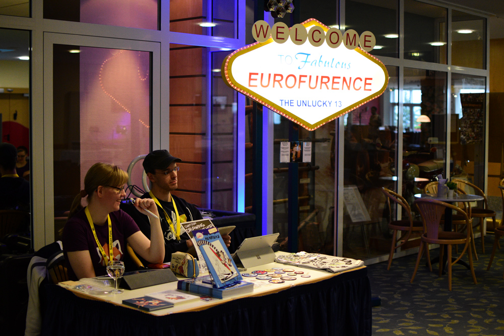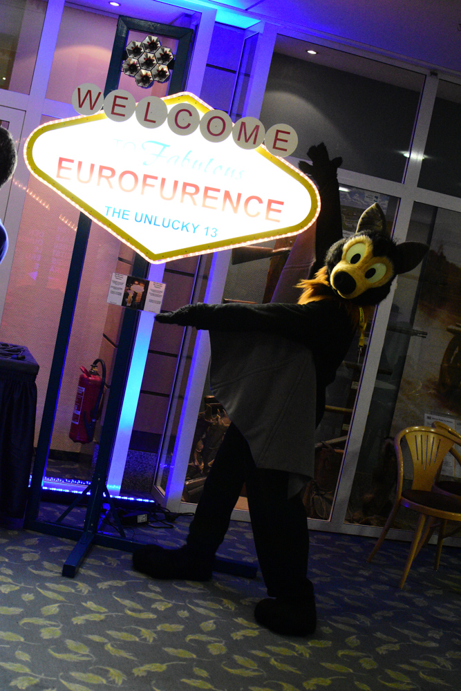We had breakfast with Yamavu and DaTi, after that Henrieke worked a bit on a dog drawing for the charity auction. I asked Krauti earlier about having a table in the lobby for selling merchandise and books. He was nice enough to arrange that for us, so we sat in the Lobby, next to the fabulous Eurofurence sign and sold some merchandise.
