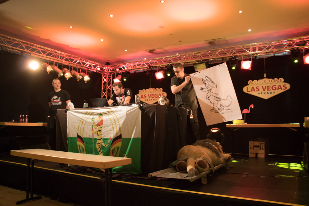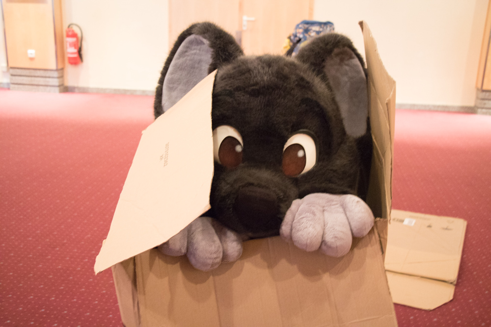 After that, we went to check out the tiny Dealers Den, located in the room where the EF photoshoot used to be. Henrieke and I talked for a while to the people running KittyFluff, an online shop for fake fur, specifically aimed at fursuit builders. They had interesting and nice quality furs! For most of the day we stayed in the lobby, hanging out with Titash, Yamavu, Mag and other friends. Henrieke and I prepared a bit of stuff to show for our "Meet the Guests of Honor" panel at 16:00. As expected, not too many people attended, but that wasn't too surprising considering that even at giant cons "Meet the GoH" panels usually attract few people. We were optimistic about the cartoon drawing panel attracting more people! The panel went well, and Krauti was nice enough to give us convention shirts and the sponsor towels which featured the EAST logo that Henrieke and I designed. After the panel we ran into Mausie in the lobby who was having too much fun with random cardboard boxes.