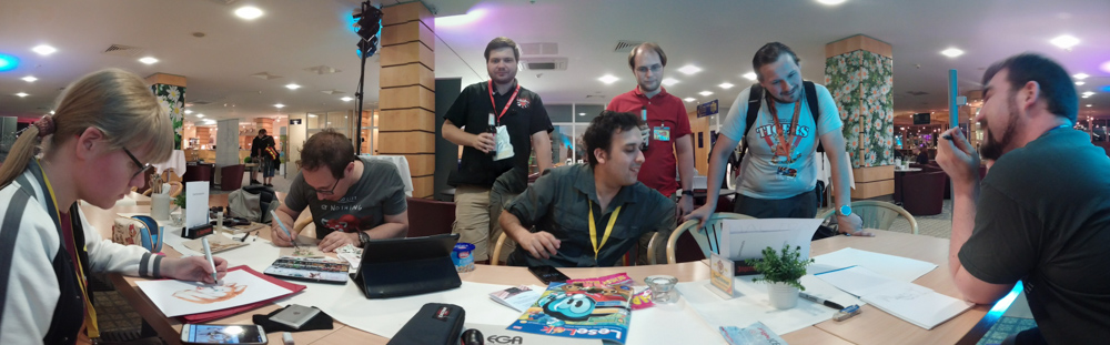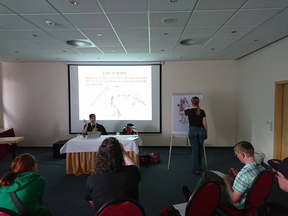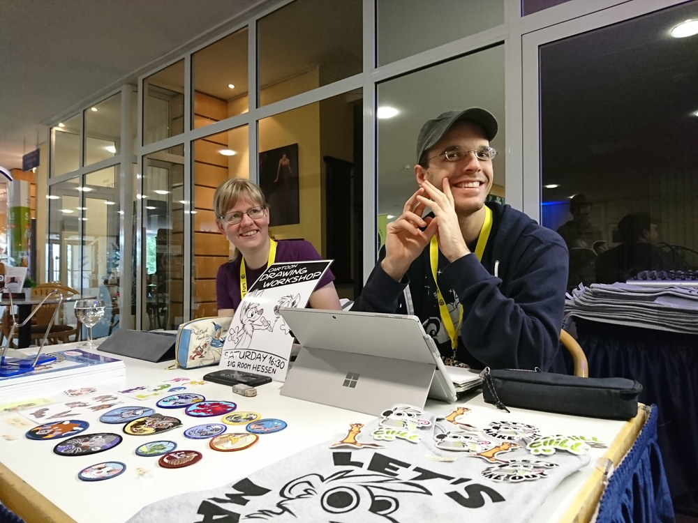 Shortly before 16:30 Henrieke and I went down to hold our cartoon workshop. It was a small group, but it was a nice amount of people! We went over the basics of drawing cartoons, just like we did at EF14 9 years ago and had some nice discussions about drawing afterwards. Henrieke also sold some of her Artistic Visions books.