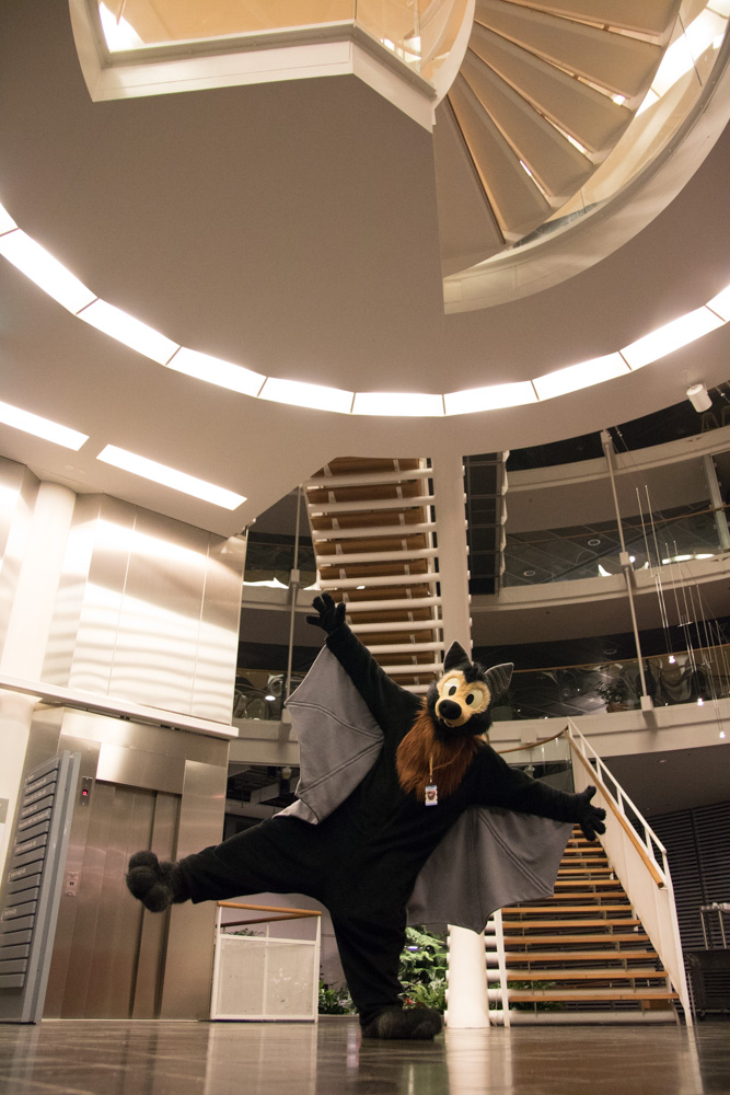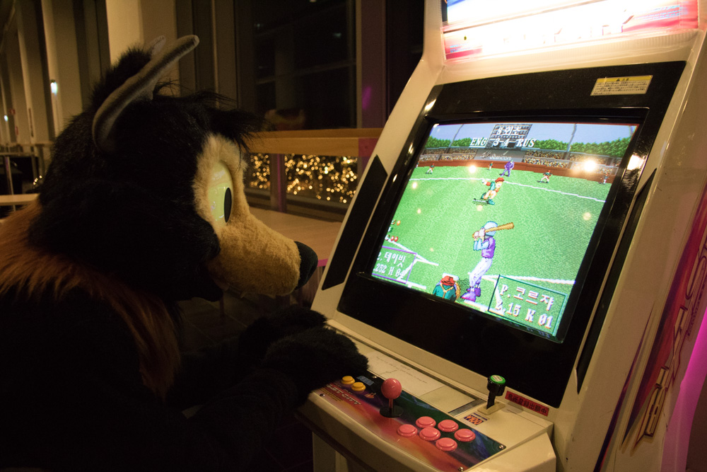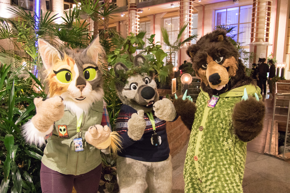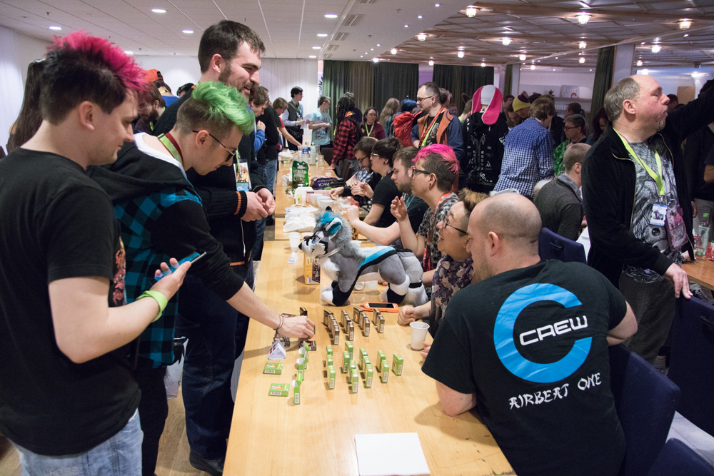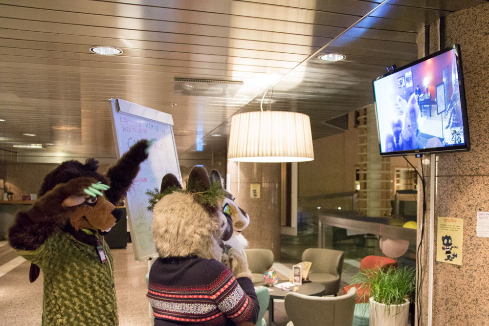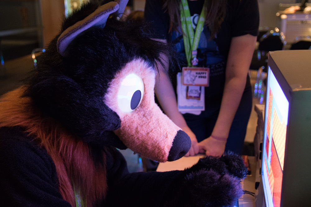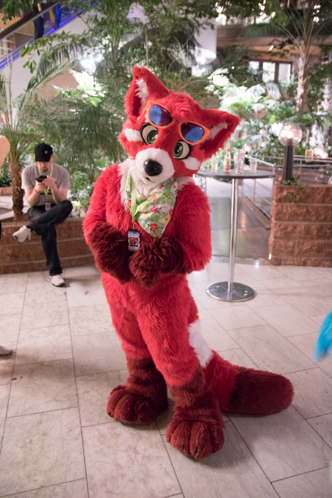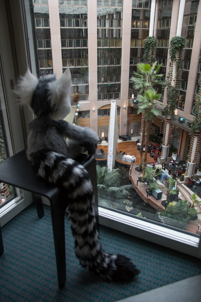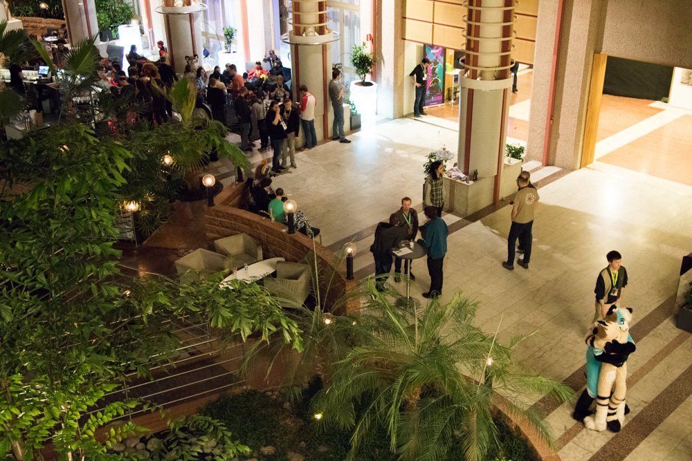 Then it was time for Baseball to come out. He went to the arcade and around the hotel. I chatted a bit with Ethan, then helped Baseball back on the room. I went down again and met Henrieke and Eko in the upstairs area. Also Chingado and Louve and Shannon in their suits. I spent some more time chatting with Ethan in the Artist Lounge. Then I did a last round in the lobby. Henrieke was chatting with Davuu. We went to bed at 2:40.