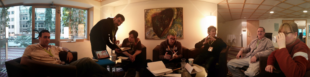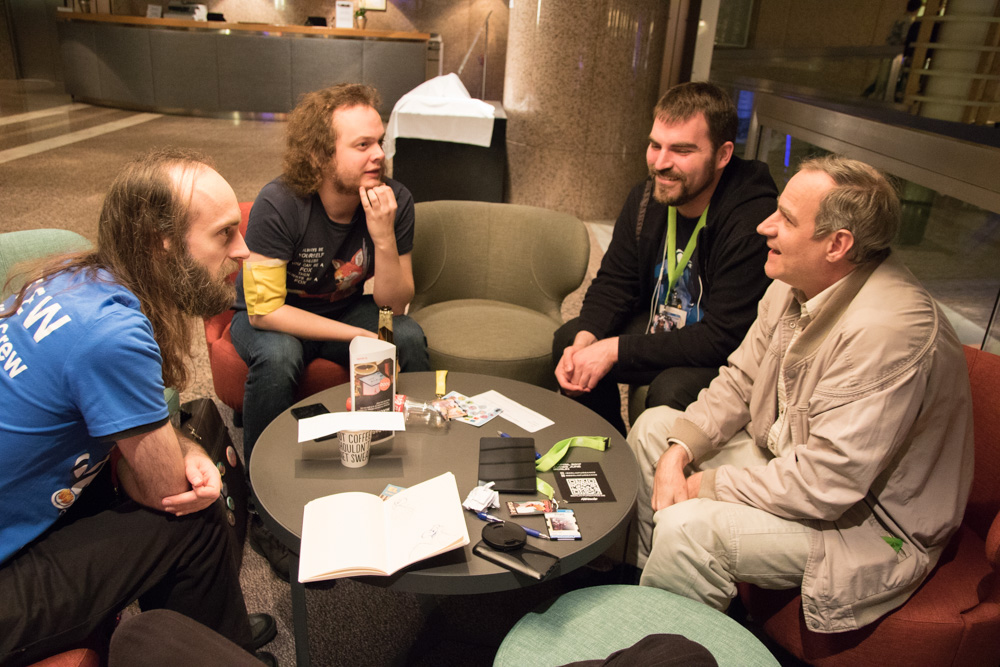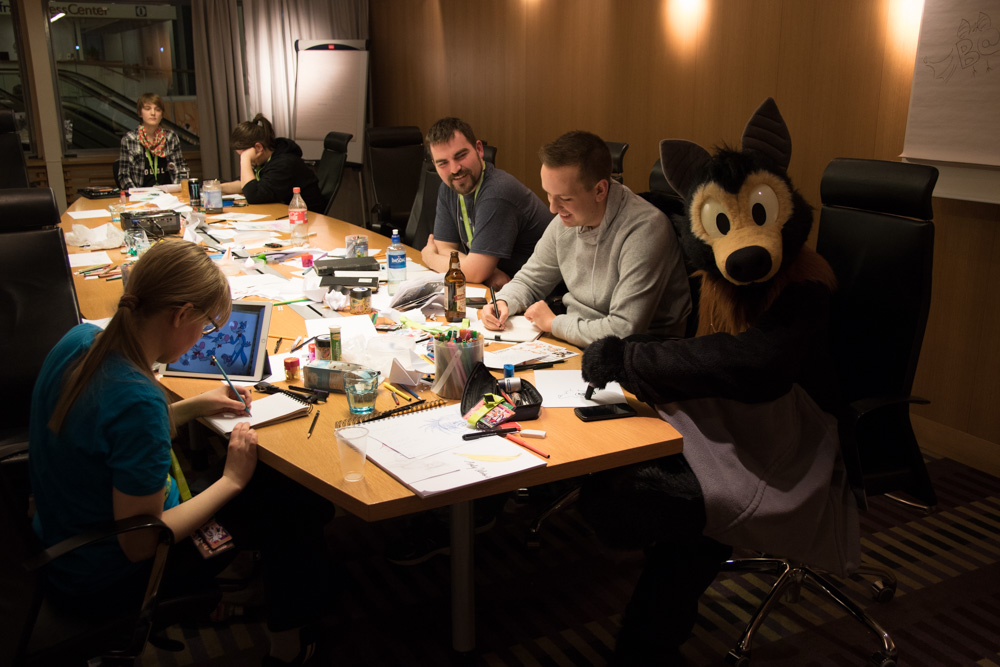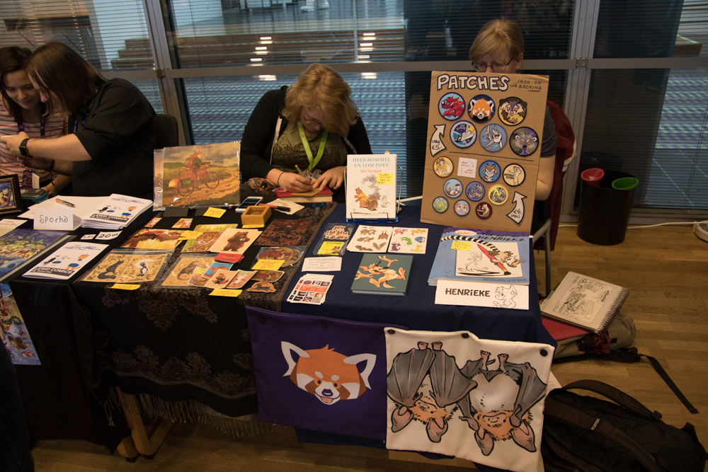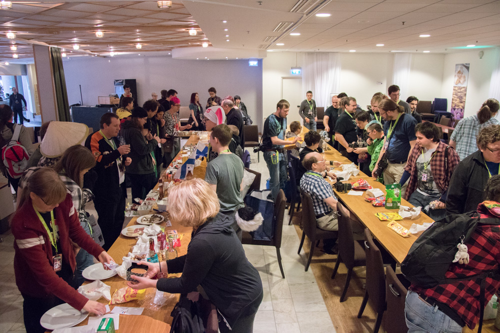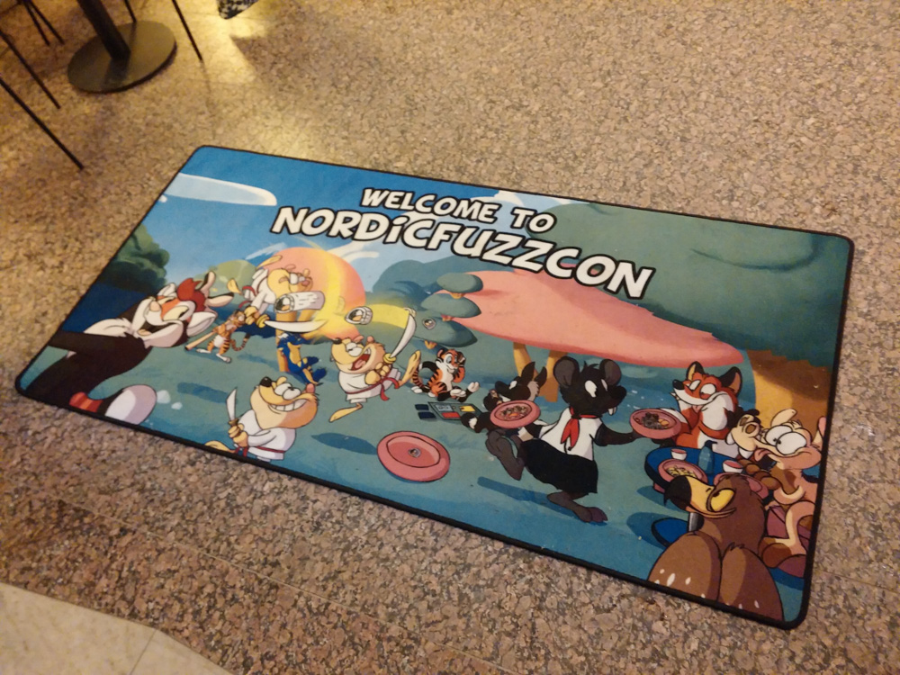 We had breakfast at 10:00 and spent some more time sitting and chatting with Procy, Mag, Sweek, Eko and Yotie. Then we went to the lottery draw, sadly no luck there. We met Yamavu outside, he bought the NFC doormat, designed by Flacko. We cleaned it a bit and rolled it up for transport. Henrieke drew Captain Haddock (The guy from the charity was dressed as him) and Mag signed Mausie certificated.