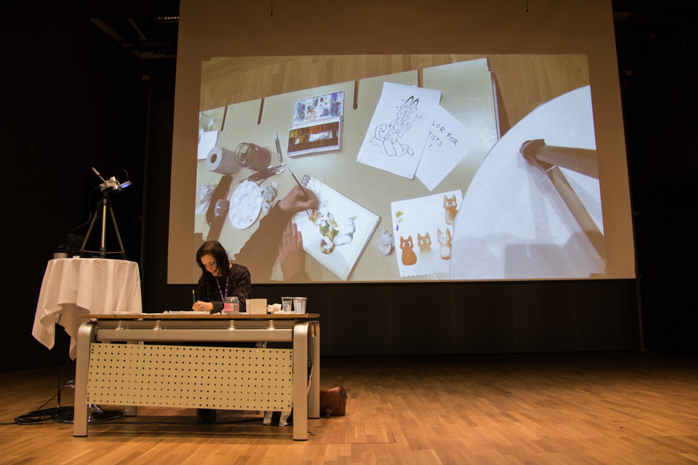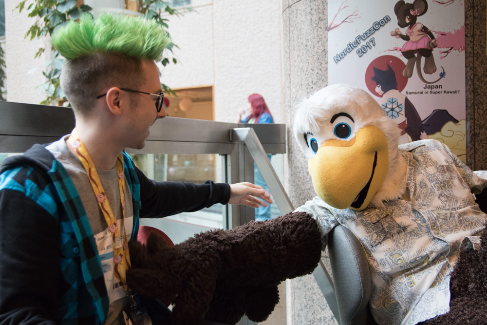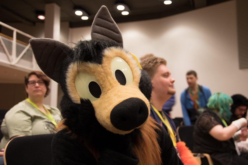 I had breakfast with Mag and Sweek, Henrieke went straight to the Dealers Den. I brought her some sandwiches there, then went to the room to shave. I checked out Spocha's watercolor panel with Louve and Mag, then I met Luno at his room and he showed me his amazing kangaroo suit!