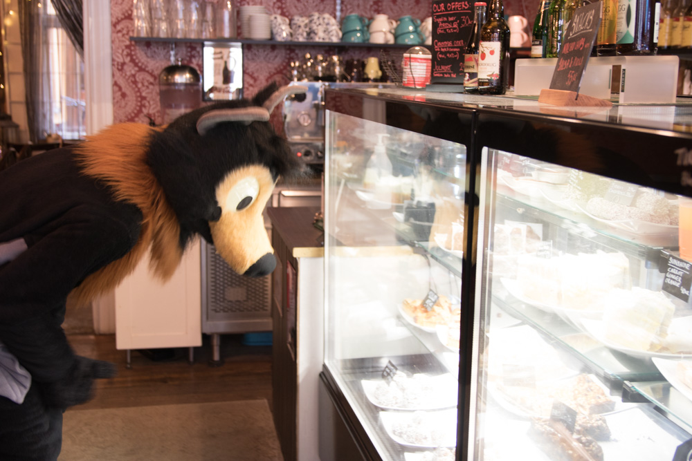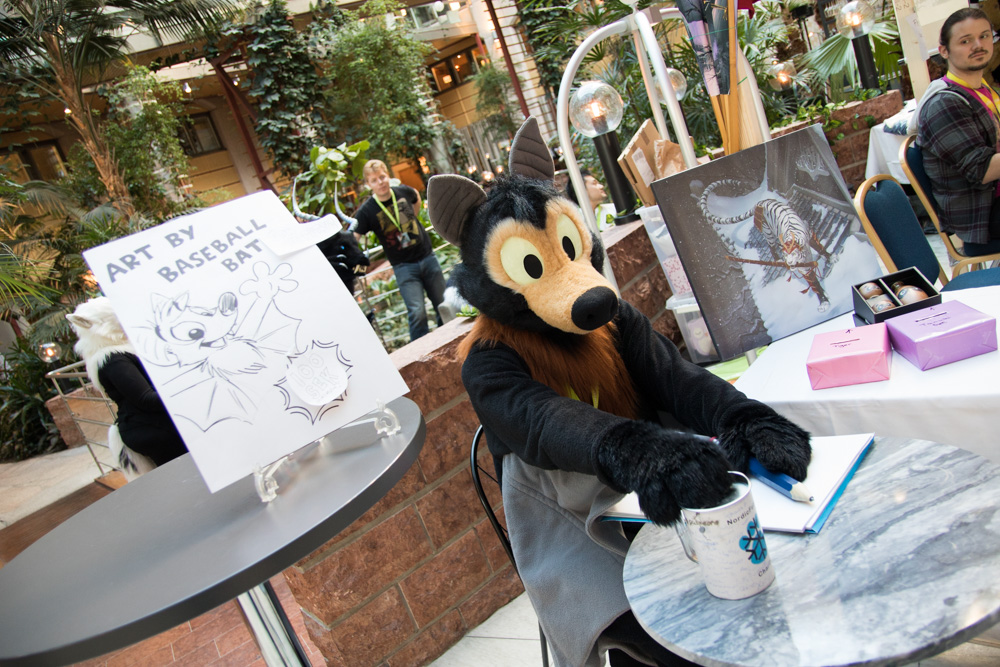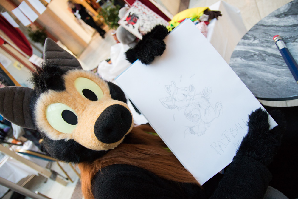 We had breakfast at 9:30 with Sweek, Mag and Eko. I helped Henrieke with setting up her Dealers Den table after, then sat together with Mag, Sweek and Procy downstairs and drew a badge for Mag. We listened to Audace and K-Mart music. After the Dealers Den opened I went there to say hi to Henrieke, then I got into suit and Baseball went to the fursuit parade, just in time. It was short but fun, and Baseball got half of a charity collection can filled in a very short time! It was also open day, meaning families with kids were at the hotel, Baseball went to the public area and played with some kids a bit! Then I got out of suit again. Ekorren brought some food from subway to the Dealers Den. I ate there with Henrieke, then I checked out the art show.