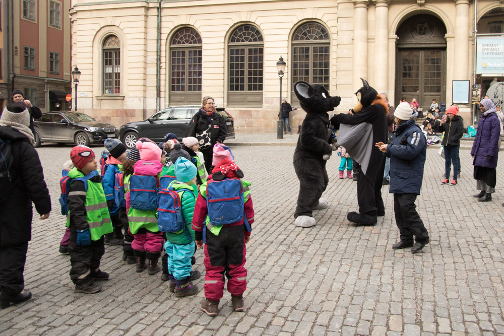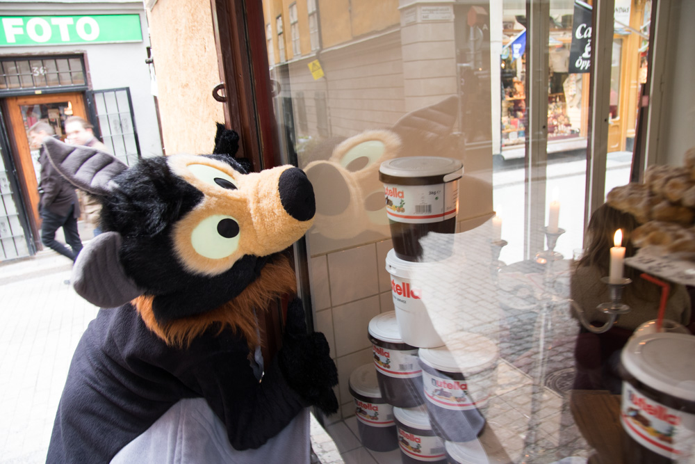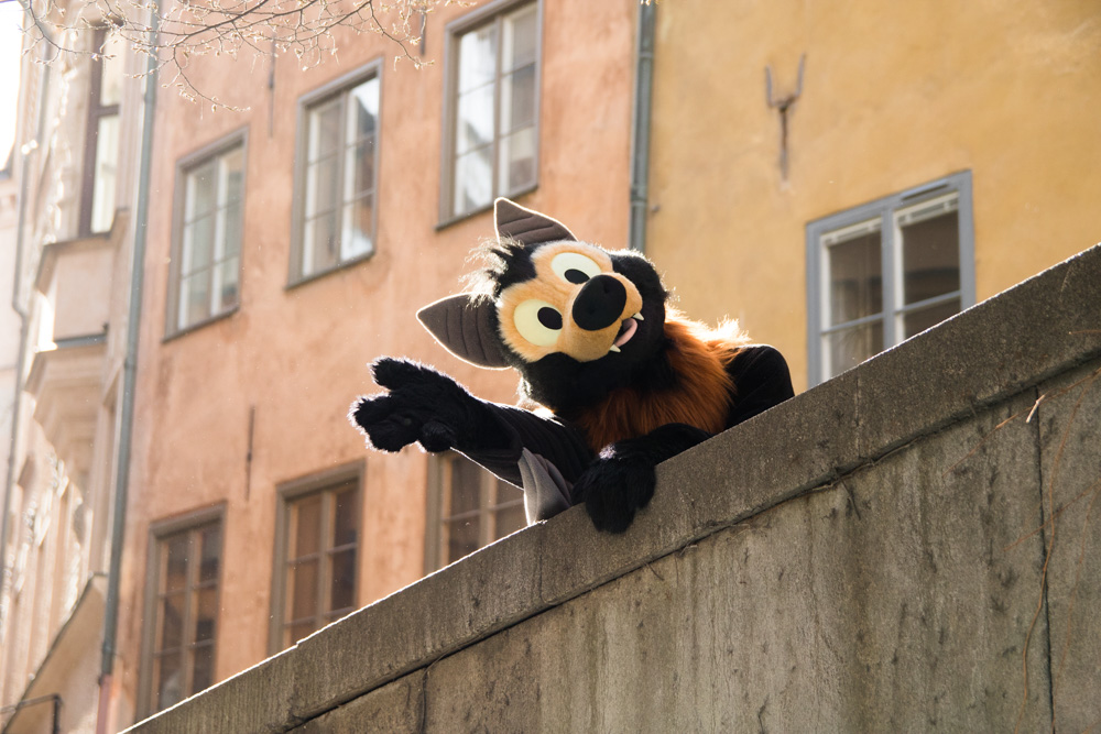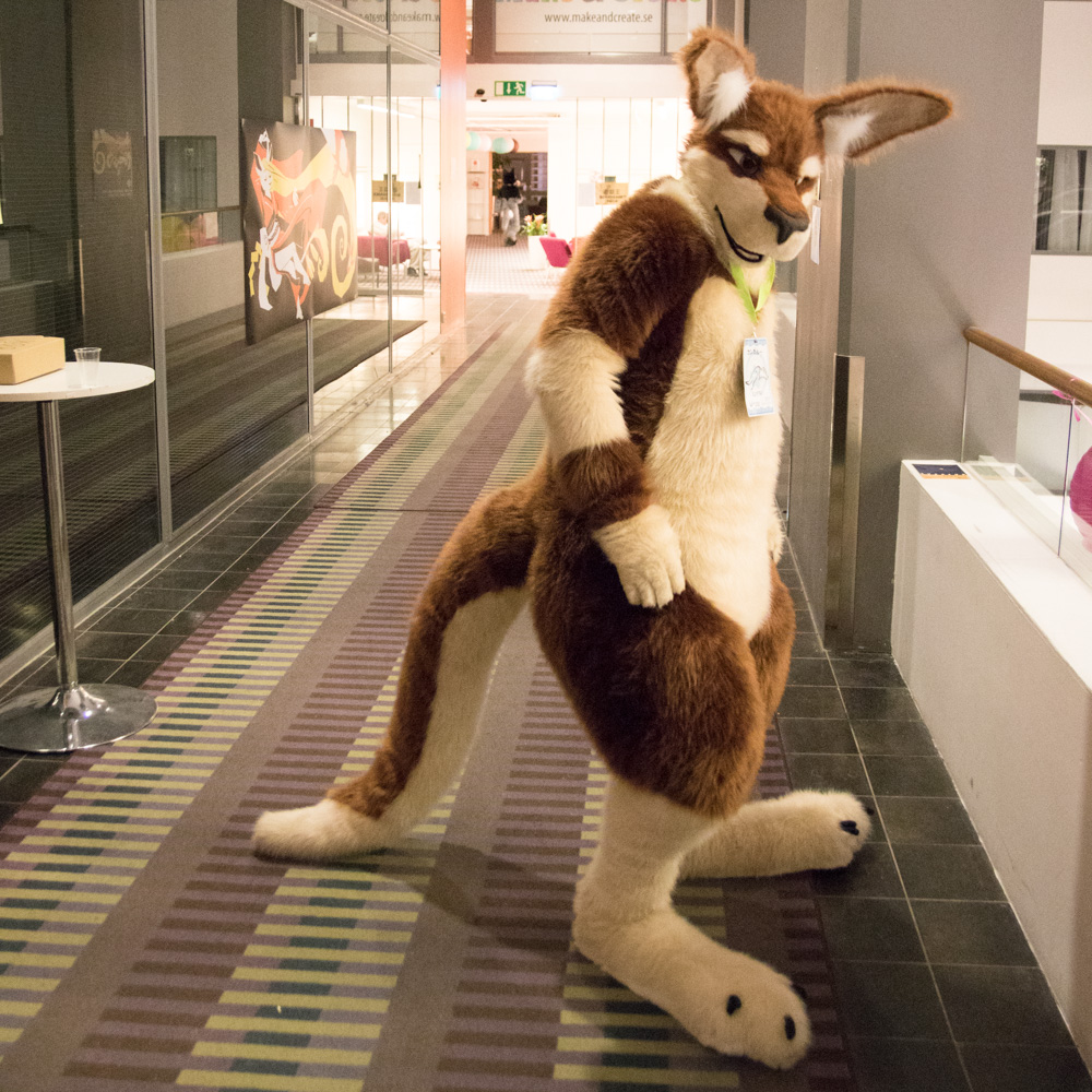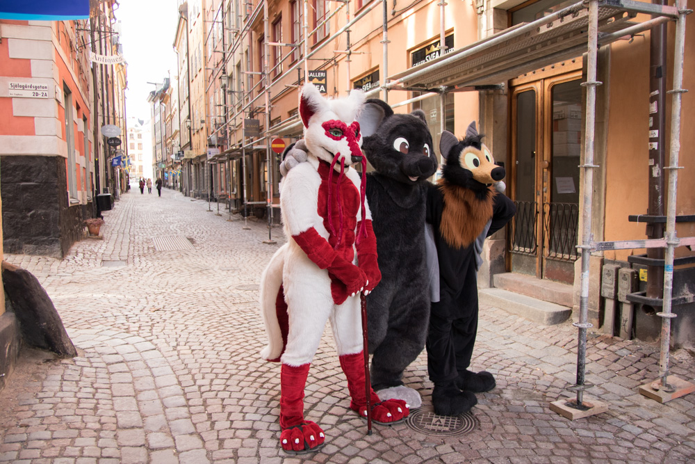 Today we did a surprise fursuit outing! Radjin and Growl were also staying in Gamla Stan, and Mausie also joined us. We all met at Radjin's hotel at around 11:00, which was only a few minutes from where we stayed. qBaseball, Radjin and Mausie roamed around in Stockholm for the next 1.5 hours!