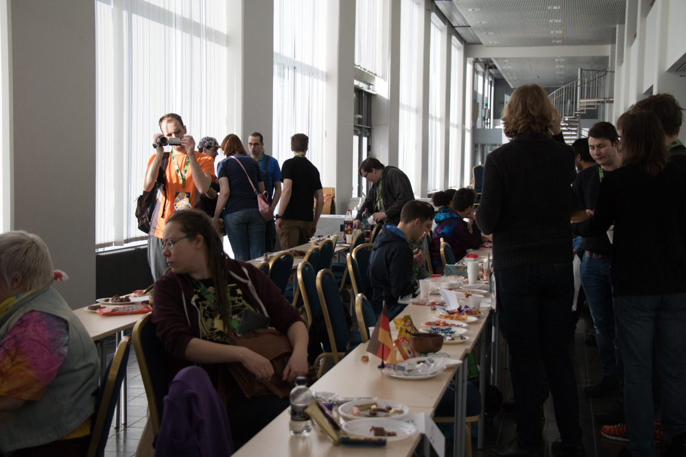 I went down to the Artist Lounge to meet Ethan, who I drew a badge for. We chatted a bit, and it was nice to hear his stories about Japan and that he successfully landed a nice job in Stockholm now! I went back up to the others then, we watched TMBG's last wave video, then we went to shorty to get some tokens for the taco buffet. Since we had to wait 20 minutes, I used that time to steam and take a painkiller since allergy didn't like me that day. At the buffet there were no tacos to be found, only burritos, and they weren't too great, but they were okay. Emejn joined us for a bit as well. After that, I tracked down Wolftale in ConOps and delivered the badge I made. I also chatted some more with Ethan and Capeh. I went to the store again with Henrieke, Mag and Yotie and got some Red Bull. Henrieke was happy to get Bilar (little sugary foam cars). The rest of the evening we spent in the Artist Lounge, scribbling things as well as playing more of the fake artist game.