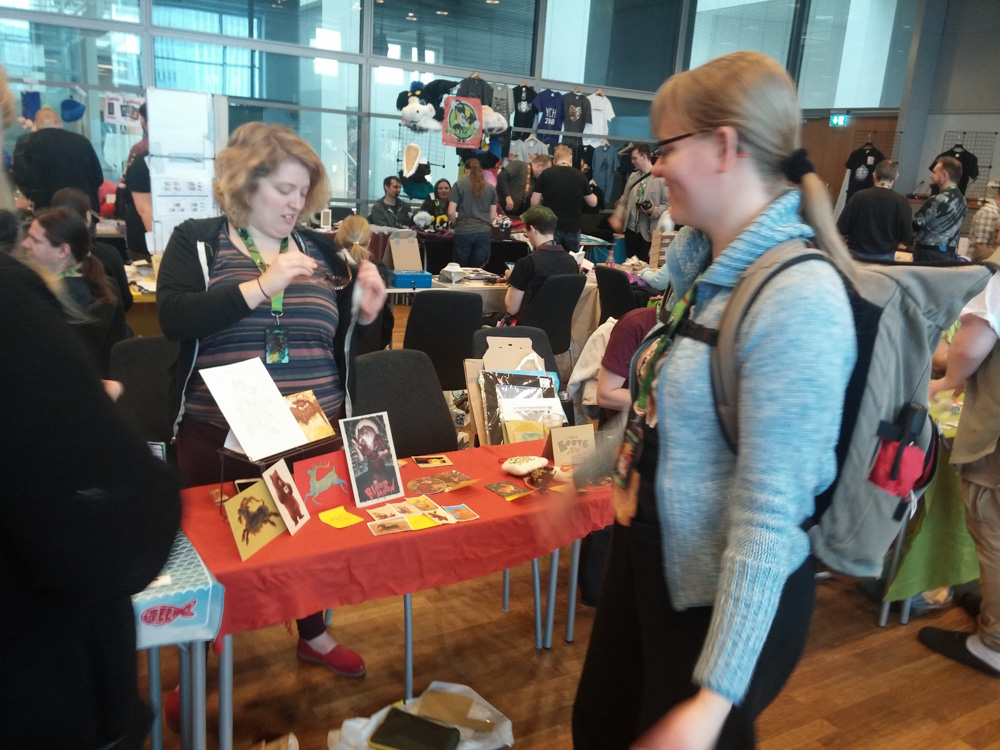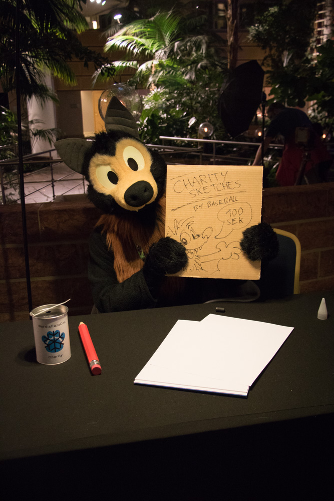 Ow, more AC/allergy headache! Had breakfast at 10:30 with Procy, Ekorren and Mag. Surprisingly, the quality of the fried bacon stayed pretty constant the whole con! After that we went to the lottery draw, sadly no luck. We did win some small prizes though, including an Indri figurine that Henrieke wanted to get for Eden. We sat on the balcony in the lobby for a bit after that and said bye to Procy, who sadly had to leave already. For lunch we went to Max once again with Yamy, Eko and Mag. Apart from a piece of plastic in my burger, it was fine. On the way back we picked up salads for dinner later. Back in the lobby, I chatted a bit with Tifou about french comics, then played some Mario Kart with Henrieke, Eko and Mag. I went back to the lobby for a bit and chatted a bit with Layown, Kaelin and Fangzahn, then went up again to pack our switch stuff and prepared things so Baseball could raise some money for charity. Wolftale helped by setting up a table, Henrieke helped carry stuff and Baseball came down to offer some badly drawn sketches for 100 SEK each! Baseball drew for over an hour, making over 2000SEK extra for charity!